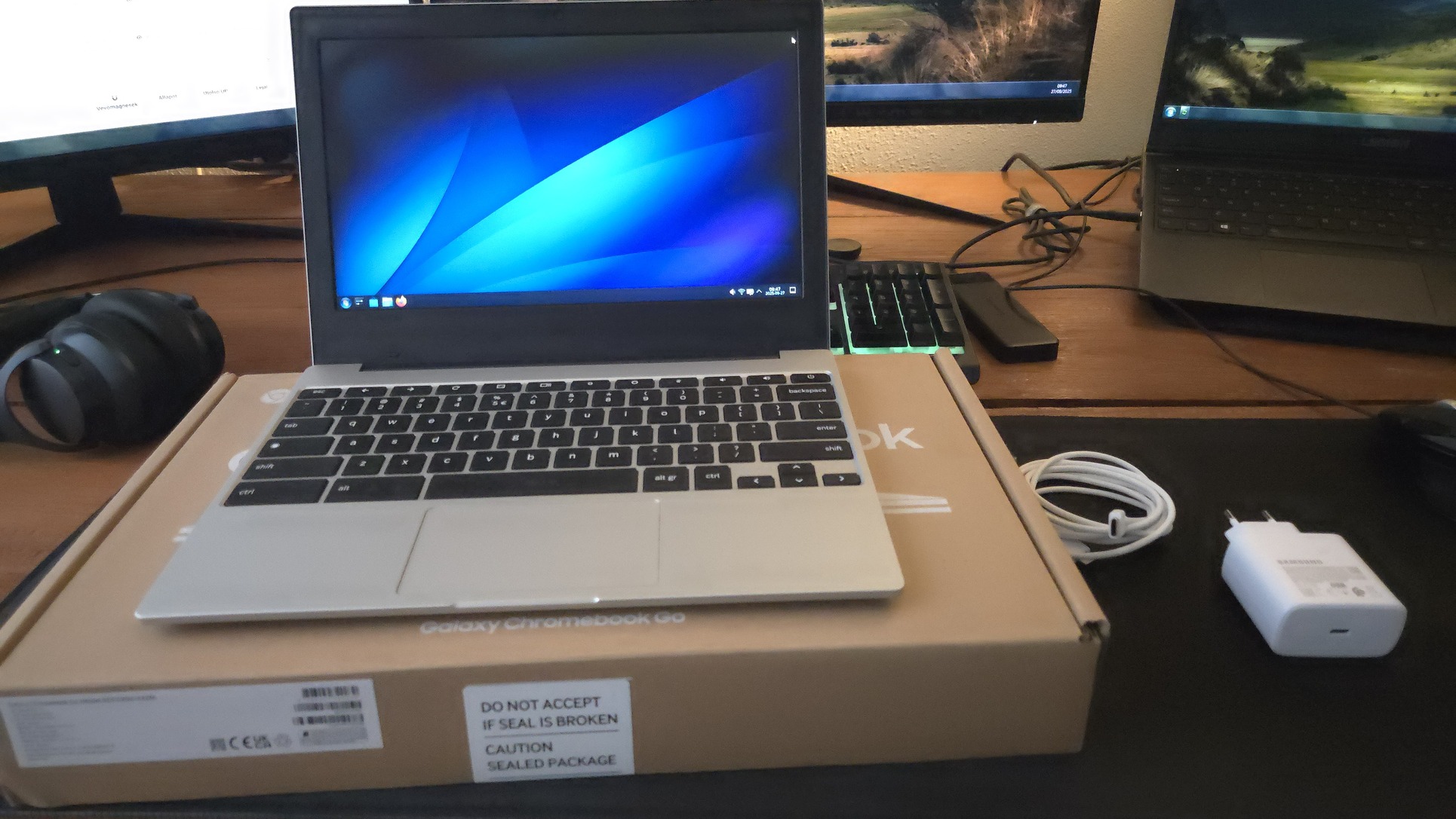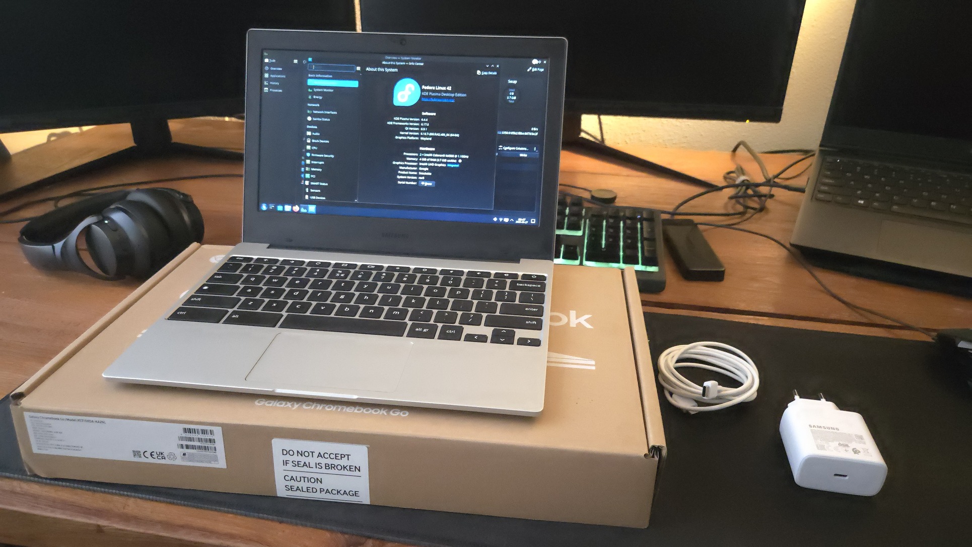 Jelenleg Fedora 42-vel fut, nemzetközi billentyűzet. Tokkal, dokkolóval, töltőjével, dobozában és egy 512GB Patriot MSD kártyával.
