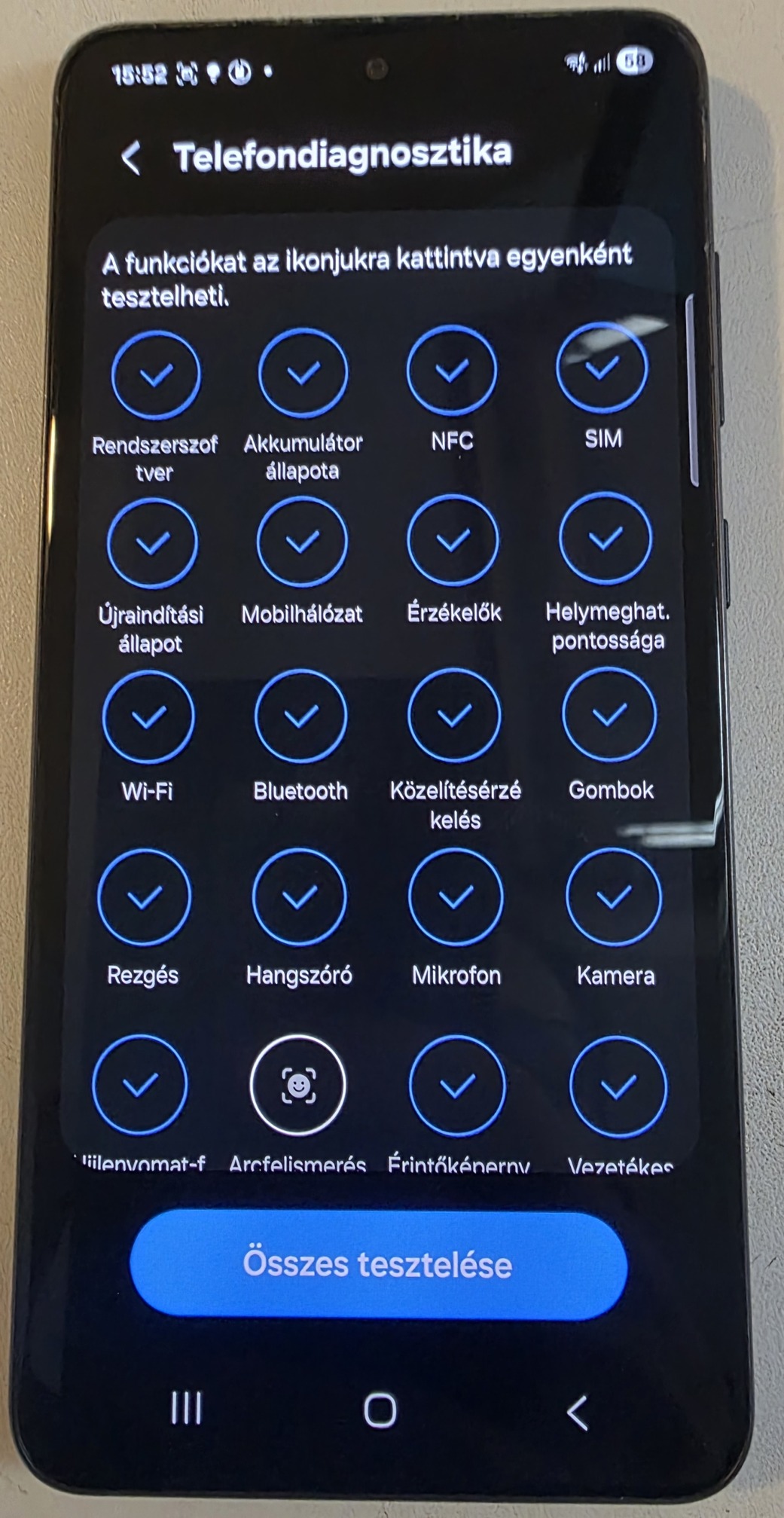 Minden funkció (kamera, hangszórók, mikrofon, hálózatok) hibátlanul teszi a dolgát. Lefuttattam a gyári hardveres diagnosztikai tesztet, a képek közé feltöltöttem az eredményt.