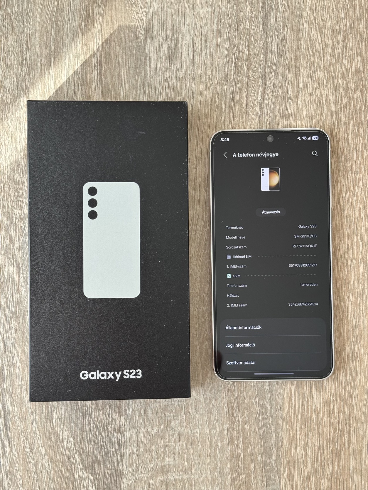 Eladó címben említett, gyönyörű szép állapotú krém színű Samsung Galaxy S23 készülék, 256GB UFS 4.0 tárhelyjel, minden tartozékával, zöld színű Nillkin tokkal. Kijelző karcmentes, üvegfóliával védett kezdetek óta.