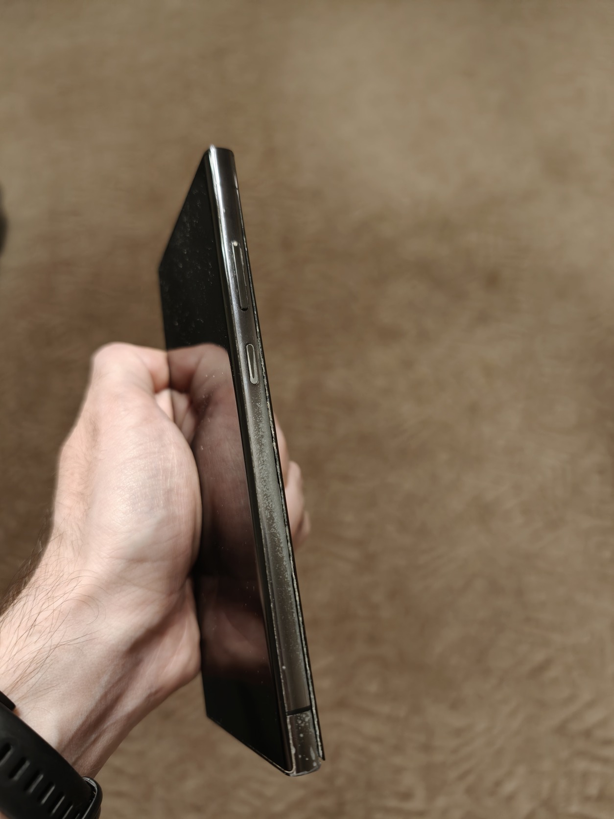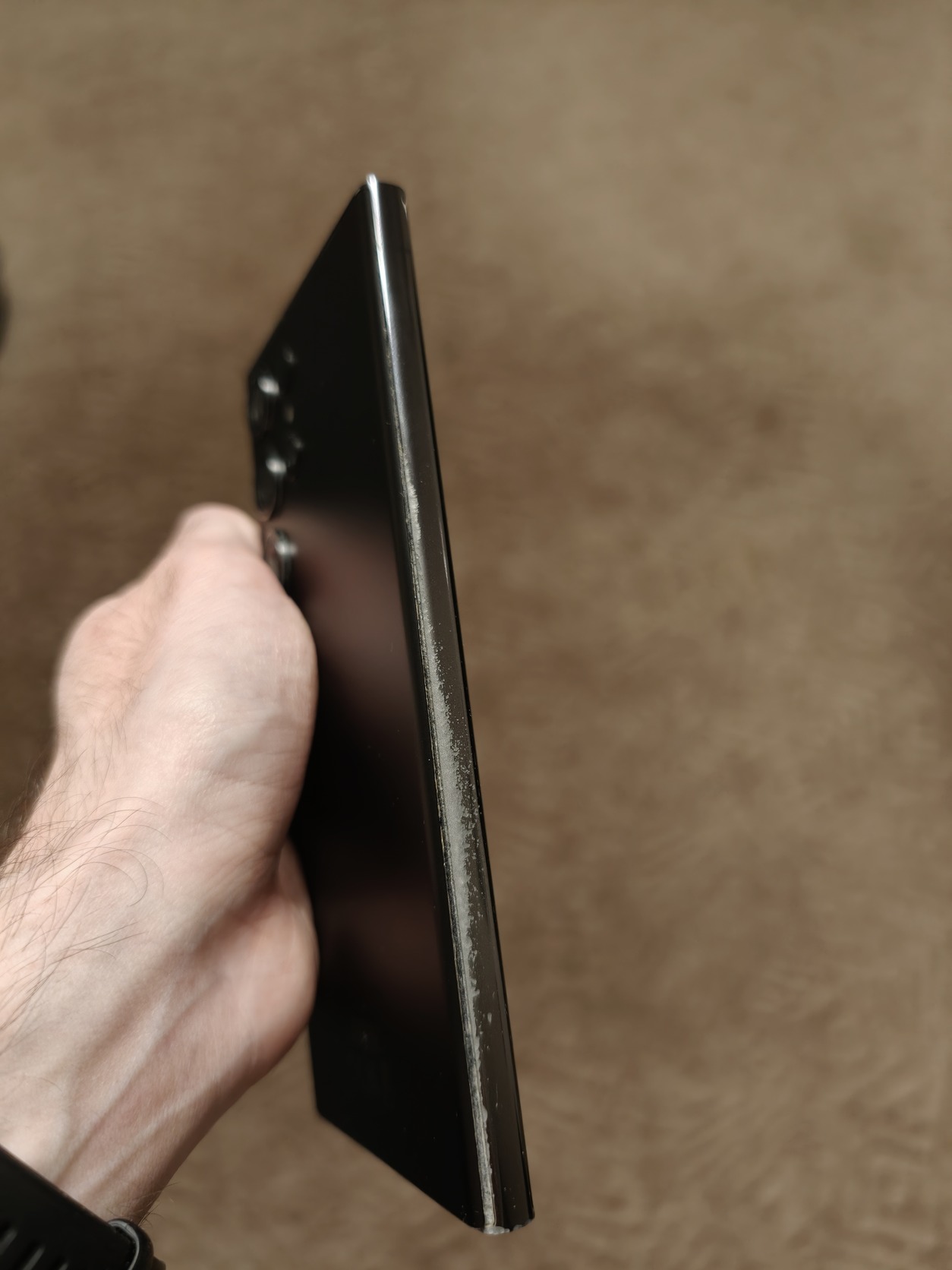 A készülék nem volt leejtegetve, a széle mégis intenzíven elkopott. (Meg az alsó kameragyűrű is.) A kijelző 9/10, csak nagyon erős közvetlen fényben lehet látni mini karcokat.