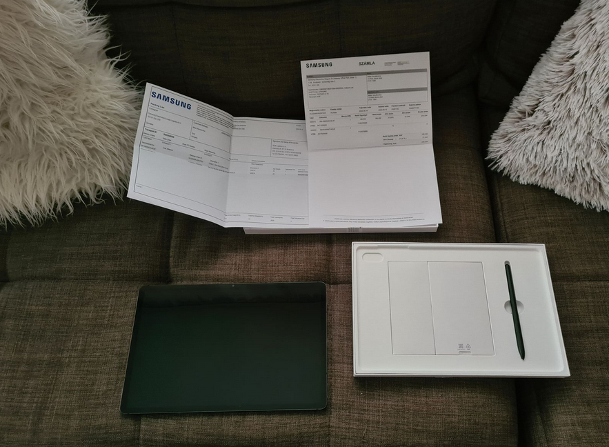 Gyári SAMSUNG által kiállított számlája és doboza is megvan. A doboz további tartalma egy érintő toll, és egy bontatlan fehér gyári töltőkábel (maga a töltő nem tartozéka).