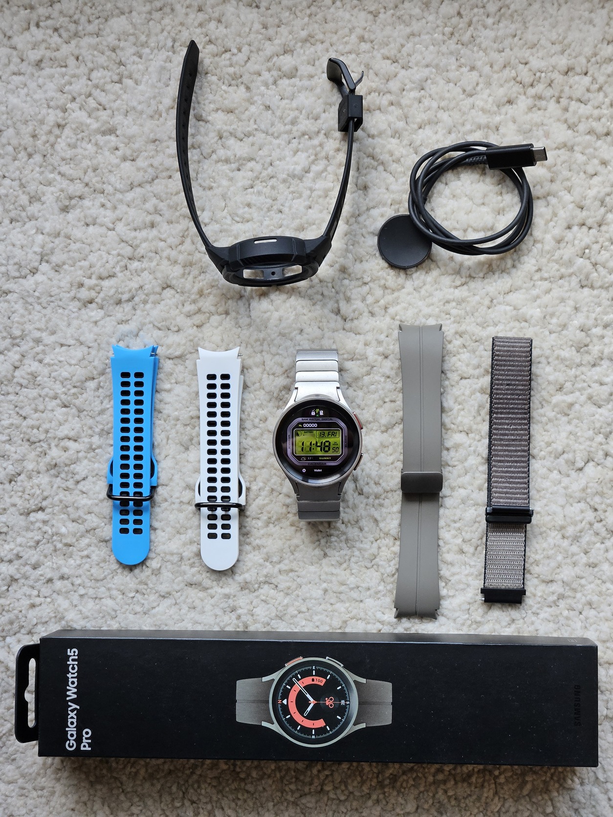 Megkímélt állapotú Samsung Galaxy Watch 5 Pro LTE (eSIM), ezüst színű okosórám eladó, a csomag tartalma az órán, túl: