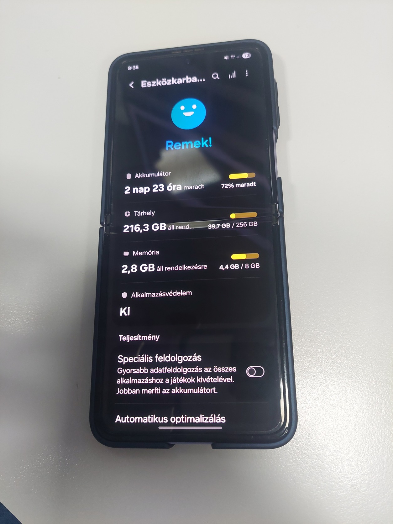 8GB RAM (+8GB virtuális) memória, 256GB tárhely.