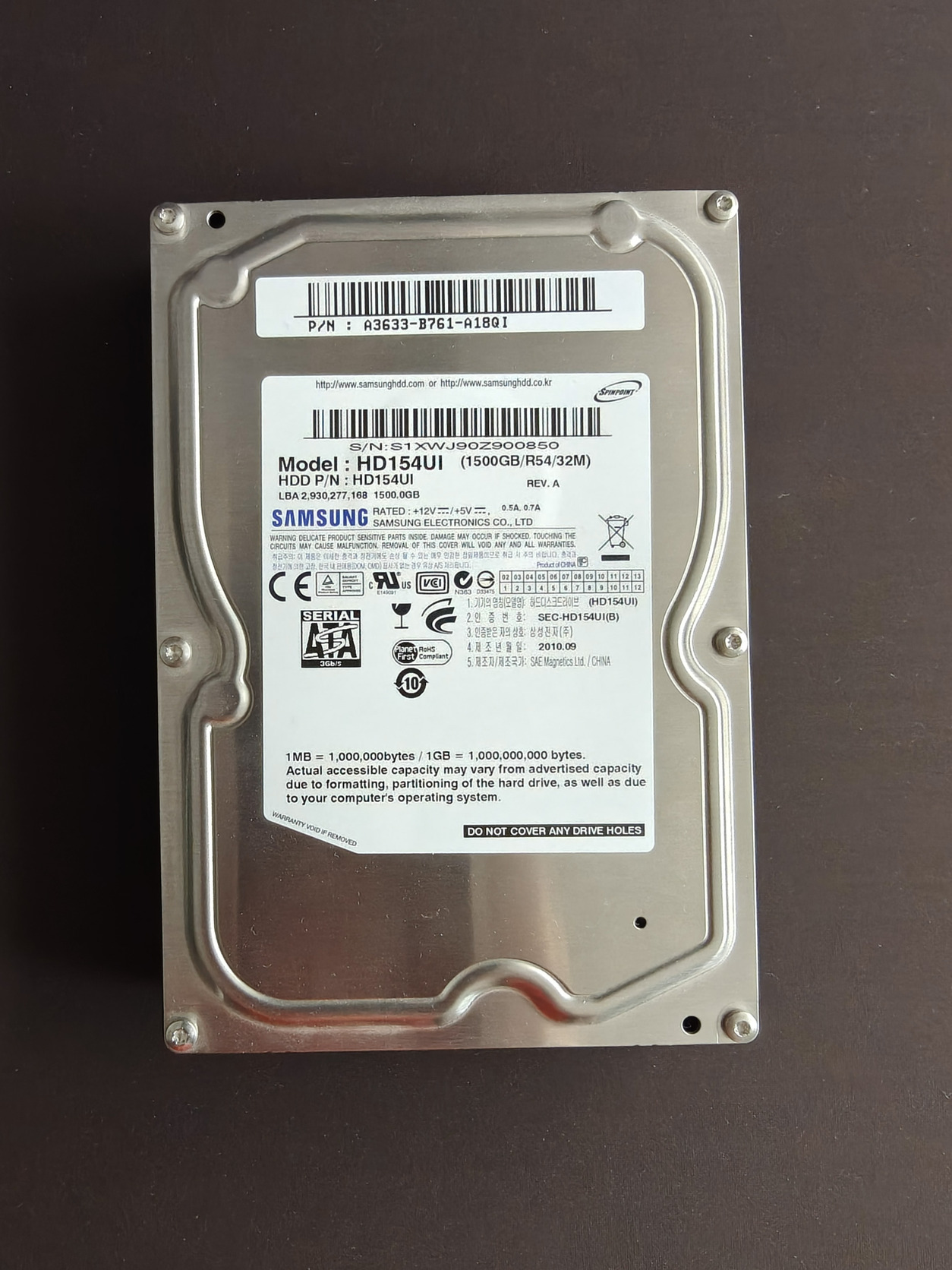 Eladó egy Samsung HD154UI 3,5" 1,5TB belső merevlemez. Külsőre ép, a csatlakozók is, és a belseje is elméletben hibátlan a Smart adatok alapján (link lent). A HDD formázott, teljesen üres. SMART adatok alapján 220 hibás szektor van rajta. Egyéb ismert hibája nincs, furcsa hangot, zörgést és egyéb rendellenességet nem tapasztaltam