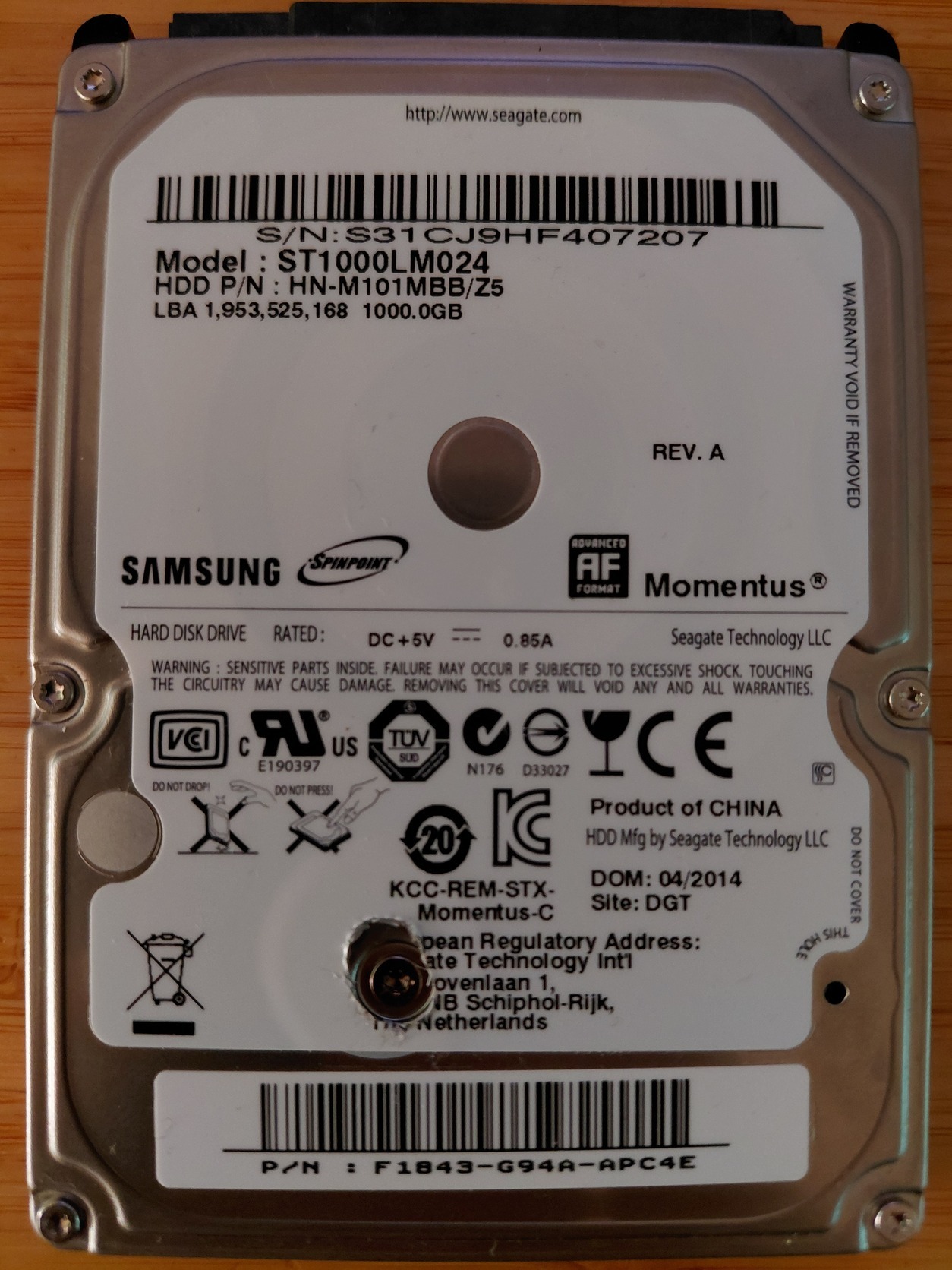 KCC-REM-STX-Momentus C, REV. A. 2014/04-hez közeli gyártási dátummal, ha ez lehetséges. Frissítettem a képet, hogy az aktuális példányt mutassa.