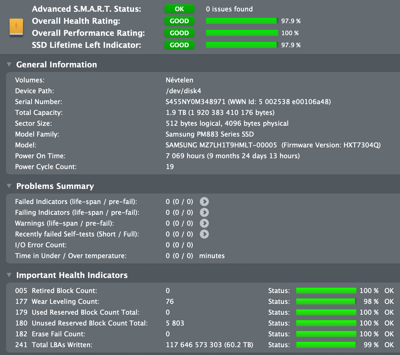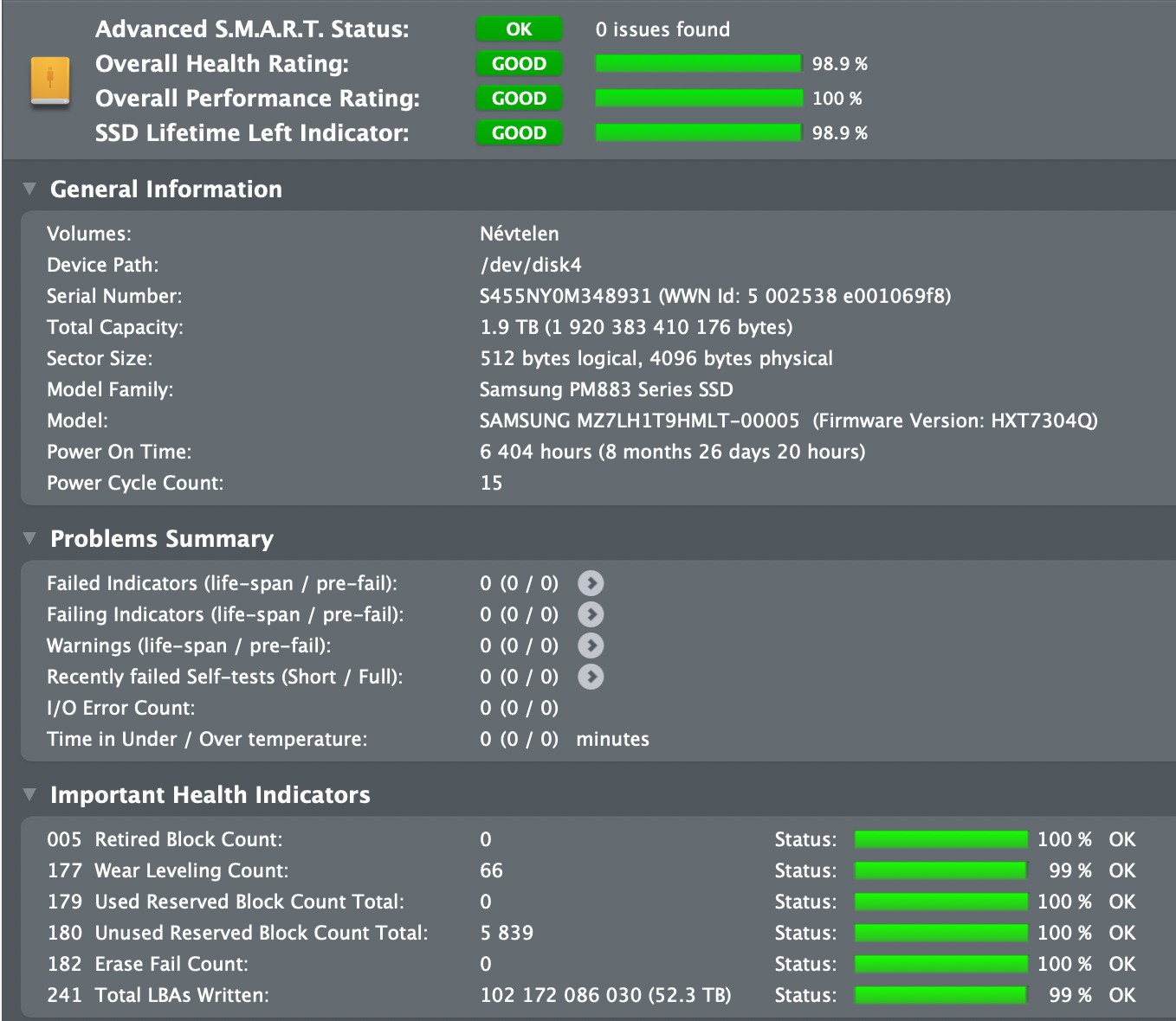 8-9 hónapos üzemidővel, 50-60 TB írt adattal.