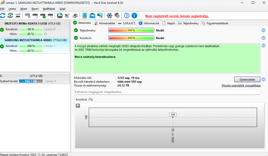 2) PM883 7.68TB (jegelve)Teljesítmény / Kondíció: 100 / 100Írt adatmennyiség: 24,12 TBRuntime: 1232 napÁr: 102 900 Ft