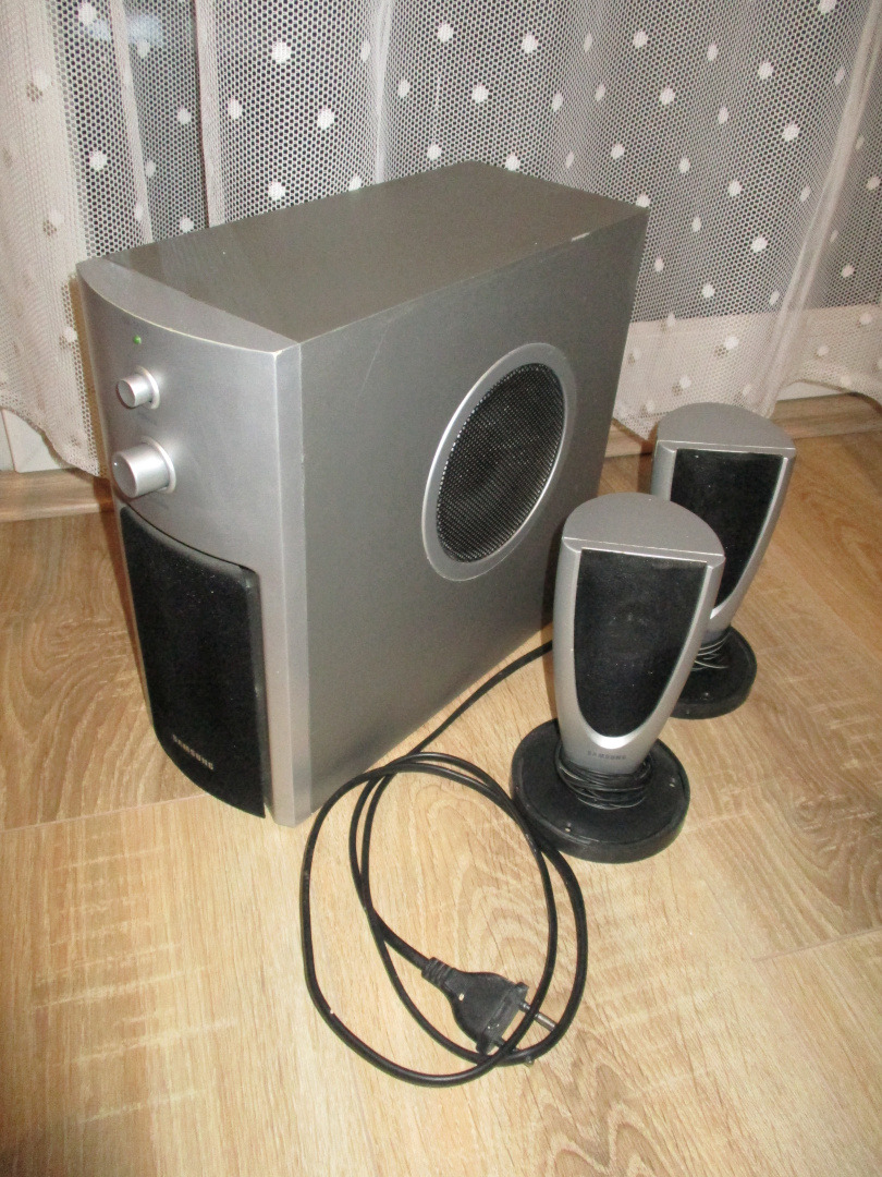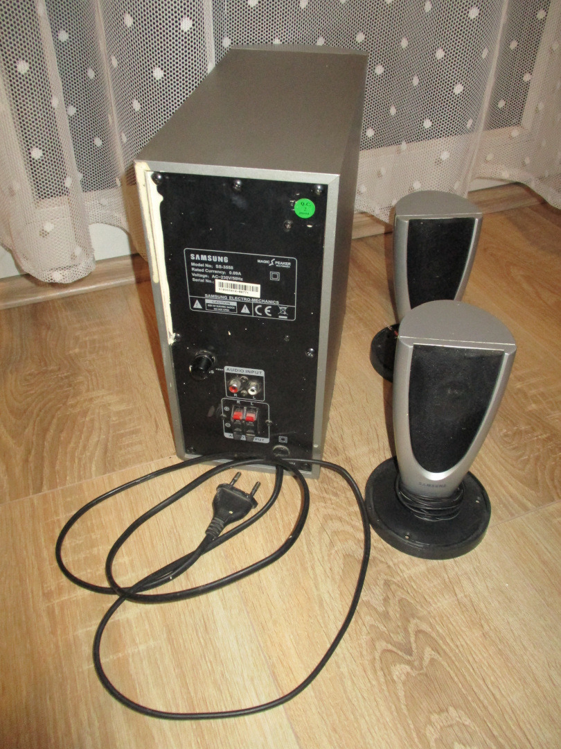 Samsung SS-3558 2.1-es hangrendszer eladó. Az egyik szatelit talpa nincs meg, ezért kókányolva lett mind a kettőre talp. Rendben megáll rajta. Karcos, kopott, randa az egész, de jól működik, szól. A mélyládán állítható a basszus is (hátul). Műhelybe, pincébe pont megfelel.