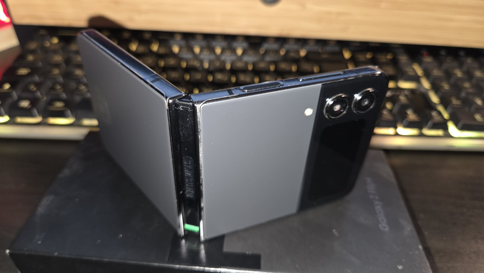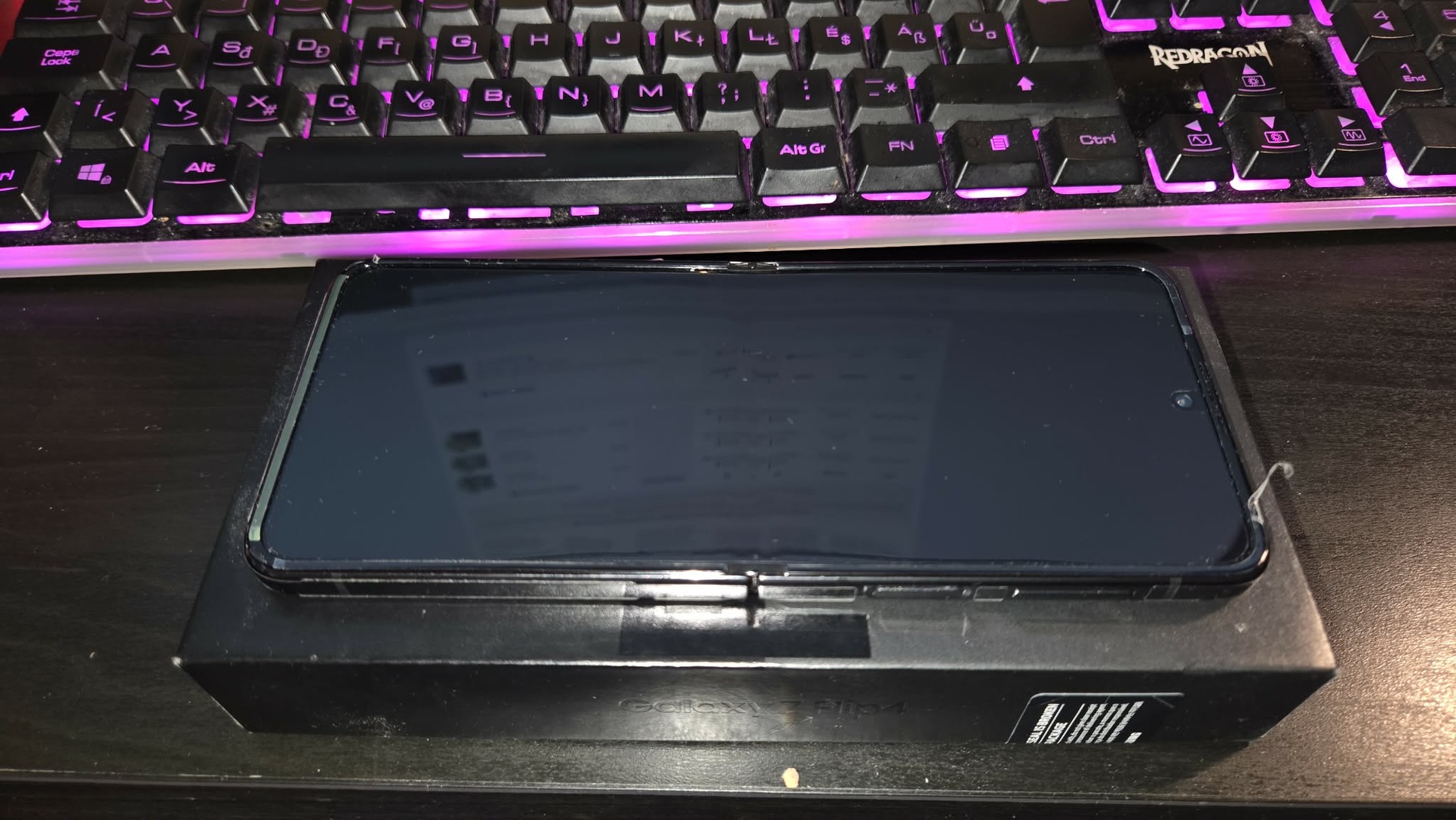 Eladó a képeken látható Samsung Galaxy Z Flip 4 okostelefon dobozával.