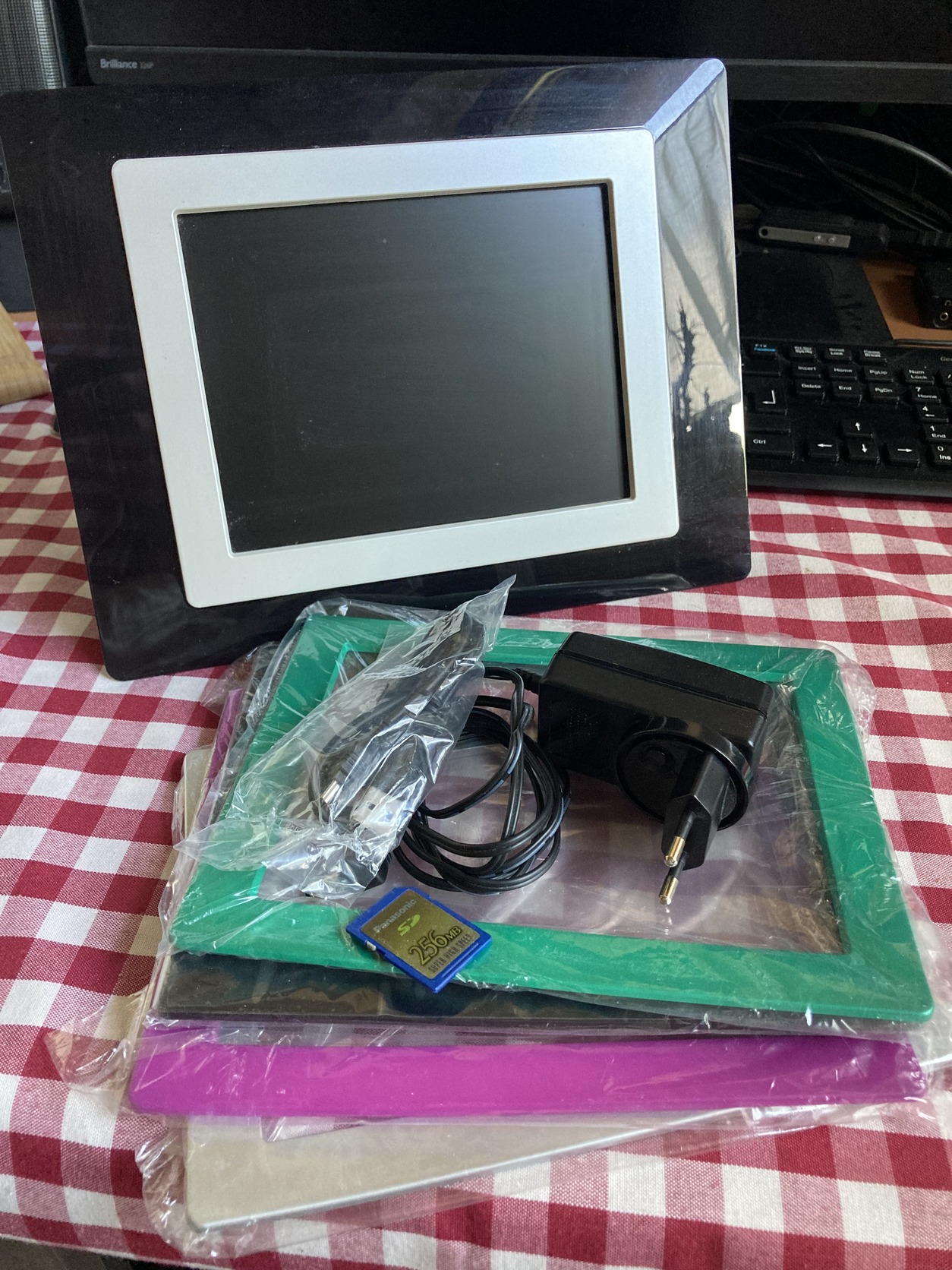 Tökéletesen működő és hibátlan állapotú 8”-os, 800x600 pixel felbontású képkeret, minden gyári tartozékával és ajándék Panasonic 256 MB SD kártyával. A távirányítója is megvan, bontatlan, csak lemaradt a képről… A keretbetét cserélhető, hogy jobban illeszkedjen az enteriőrbe. Nagyszülő kapta, de nem használta.