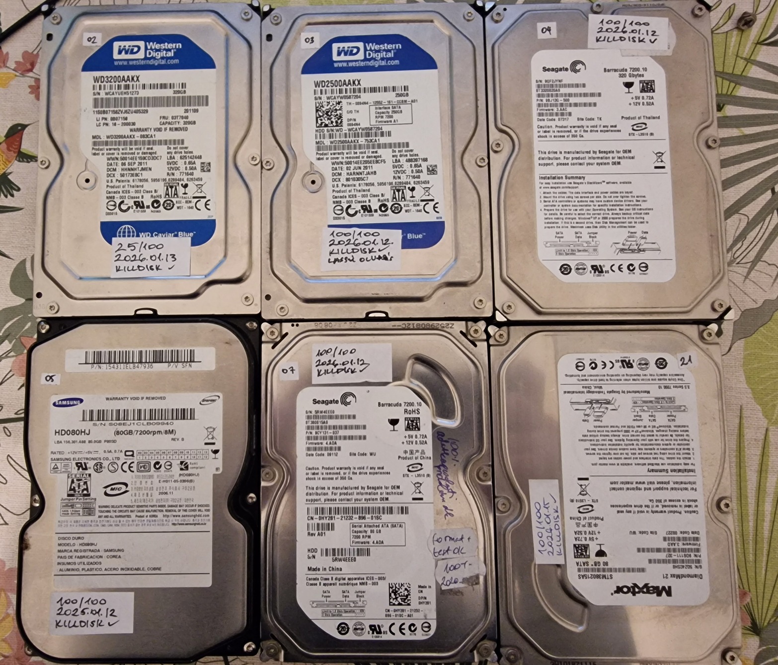 Egyben eladó a képen látható 6 db kisebb kapacitású, tesztelt merevlemez. Mindegyik működik, de nem mind hibátlan. Tesztekről tudok képeket küldeni.
