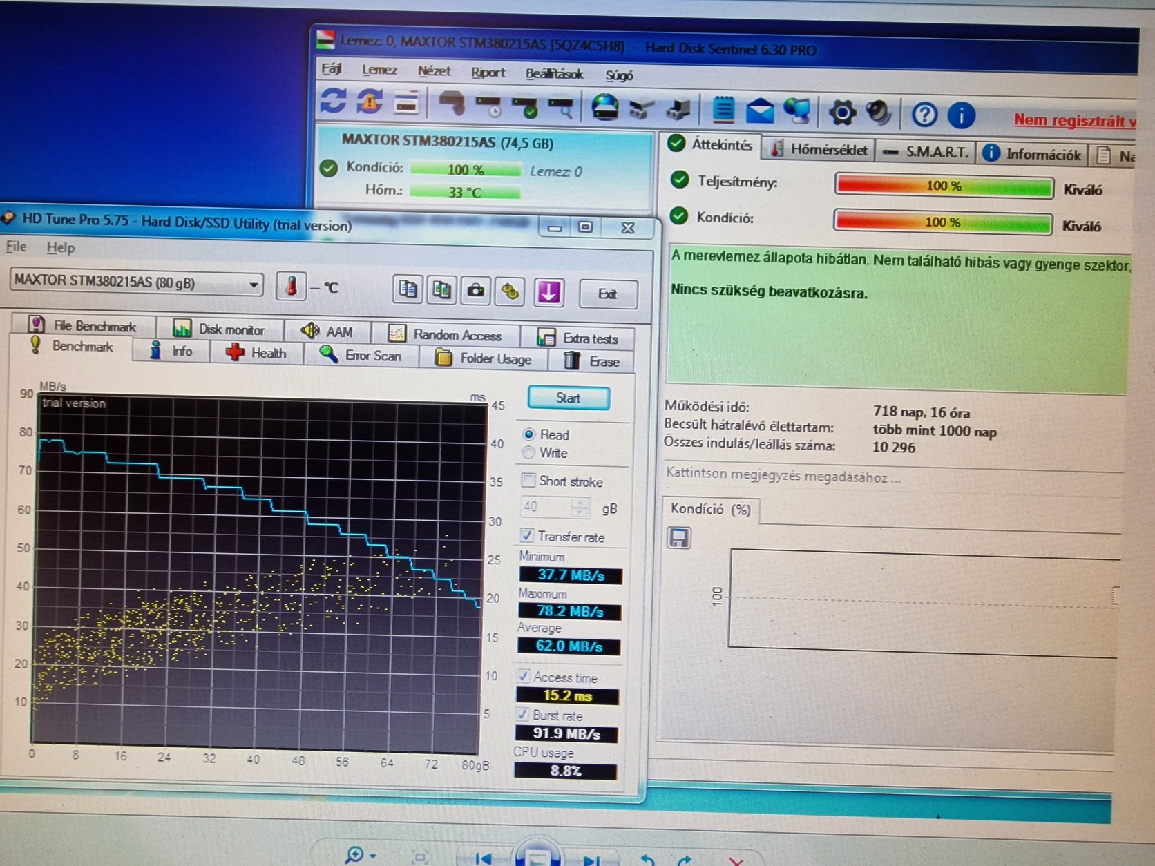 21 - Maxtor STM380215AS (80GB, HDSentinel 100/100 --- 0 hibás szektor - 718 nap, 10296 indulás, HDTune olvasás sebesség átlag 62MB/s, acces time 15,2ms)