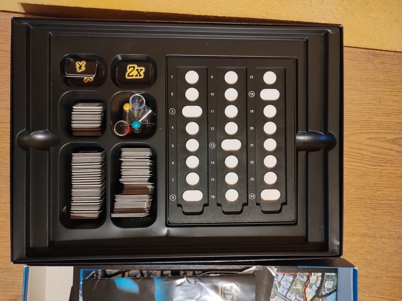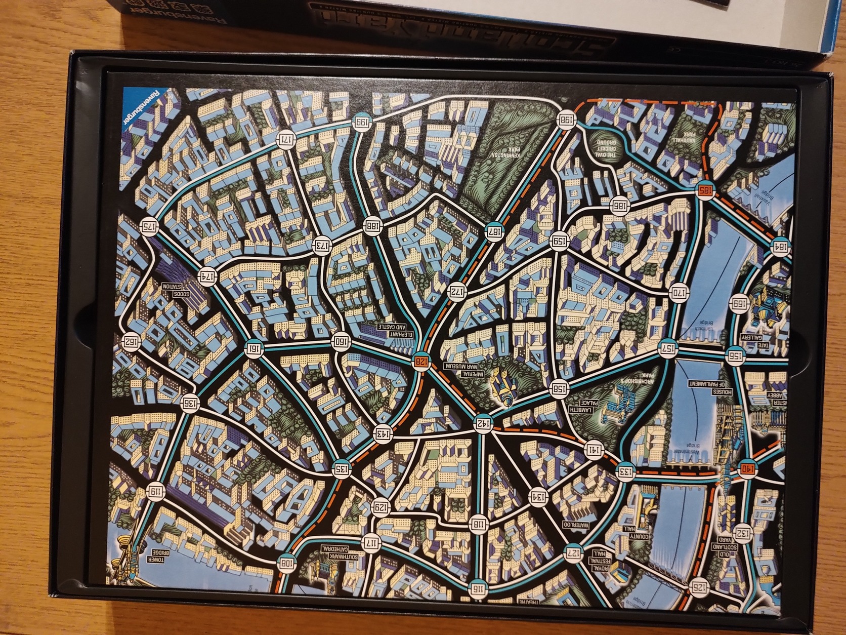 Figyelem: 125 jegyből, ha jól számoltam, akkor 3 darab hiányzik (2 busz, 1 földalatti), így a maximális 6 fős játék nem oldható meg a klasszikus szabályokkal. Kevesebb játékos esetén nincs gond.