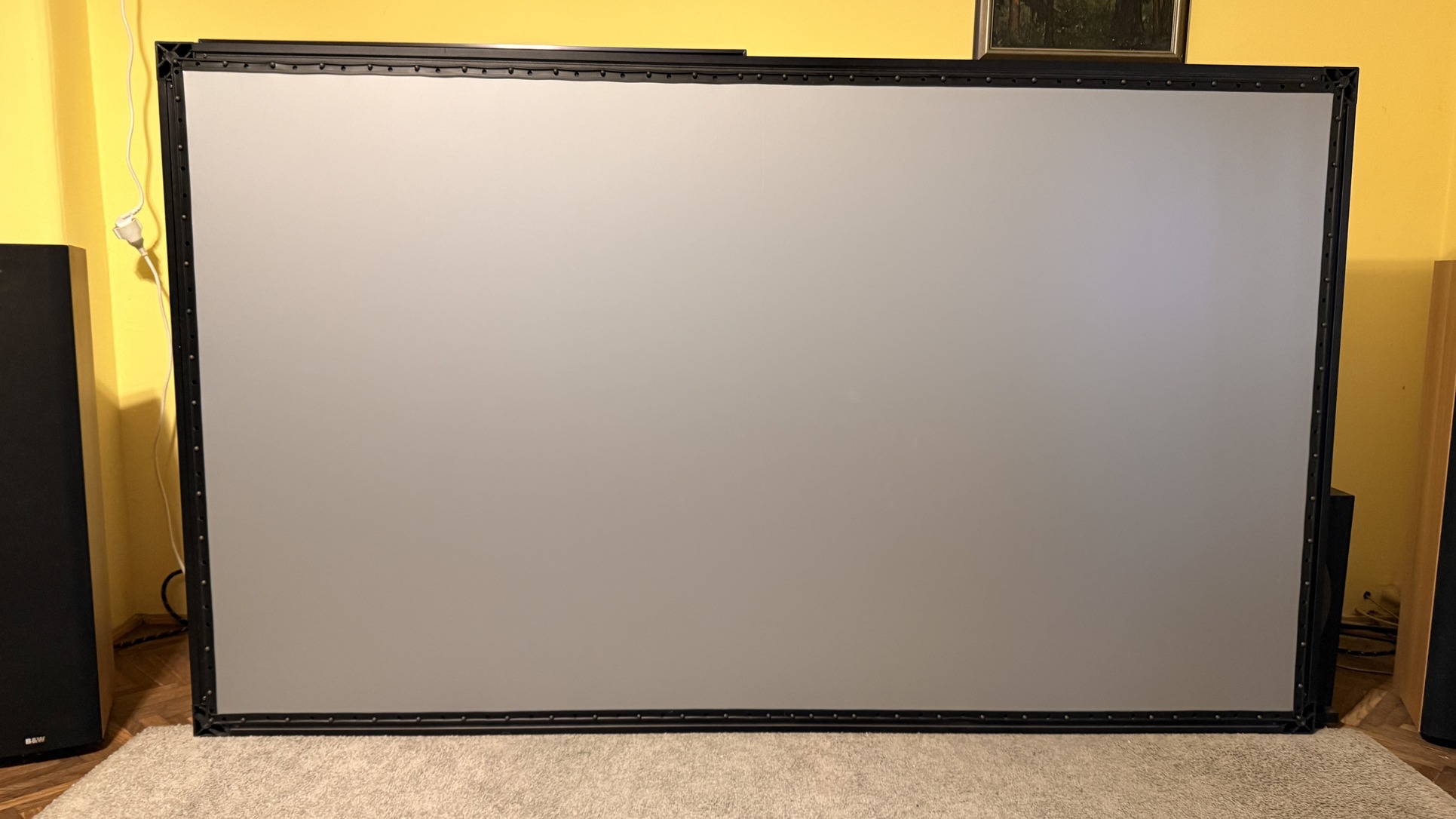 Eladásra kínálom a fent említett kezdő mozizós vásznamat. A kép látható mérete 203x114 cm, az alu keret szélessége pedig plusz 6,5 cm körben. Jelenleg már dobozában van, mivel így könnyebb szállítani. A vászon összehajtásra került, hogy beférjen a dobozba, de tapasztalatból mondom, hogy nagyon jól regenerálódik. Nem kell félni a hibás felülettől.