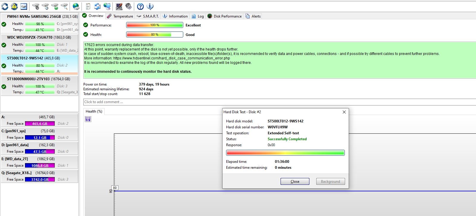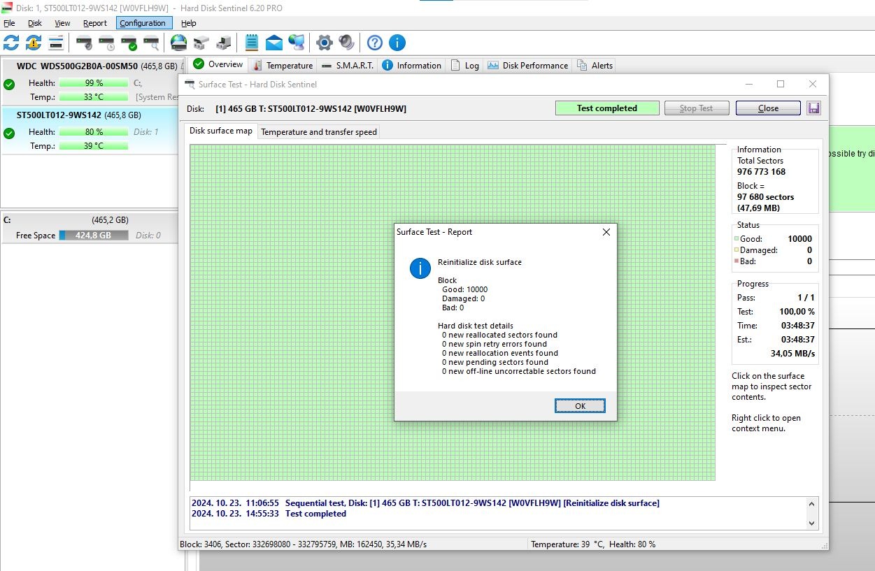 A HD Sentinel valamiért 80%-os kondíciót ír rá, de a teljes surface test és extended self-test hibátlanul lefutottak rajta.