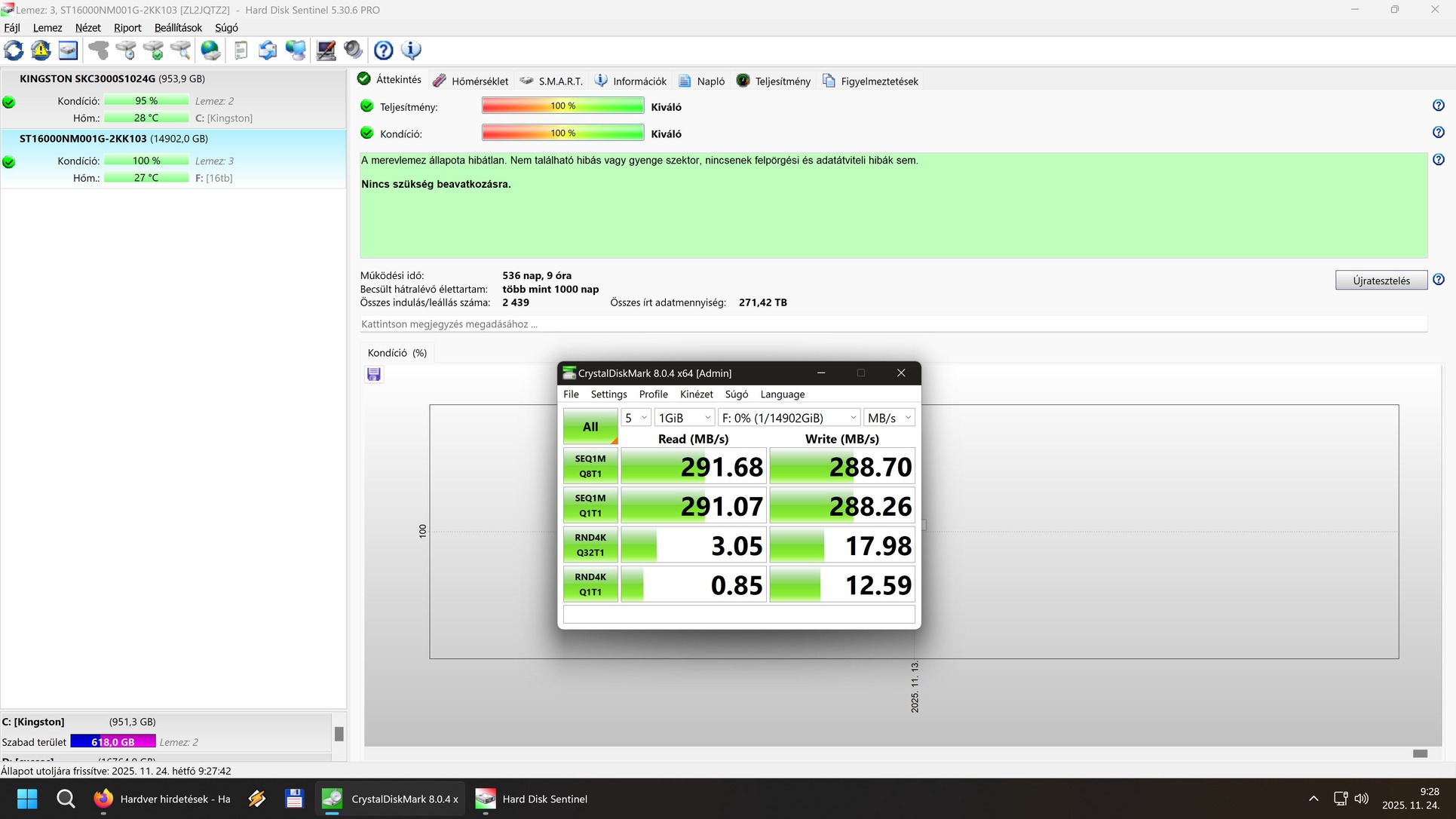 01 működési idő: 536 nap, bekapcsolás: 2439 , írt adat: 271 tb sebesség: 291/288 mb/s