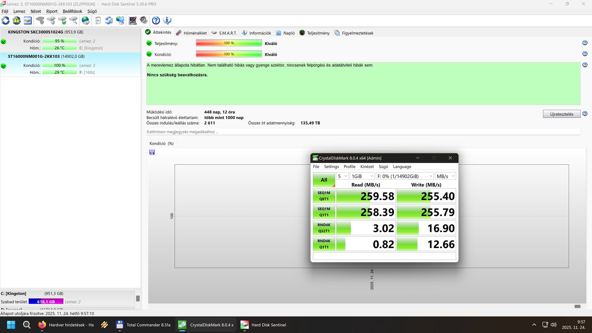 02 működési idő: 448 nap, bekapcsolás: 2611 , írt adat: 135 tb sebesség: 259/255 mb/s