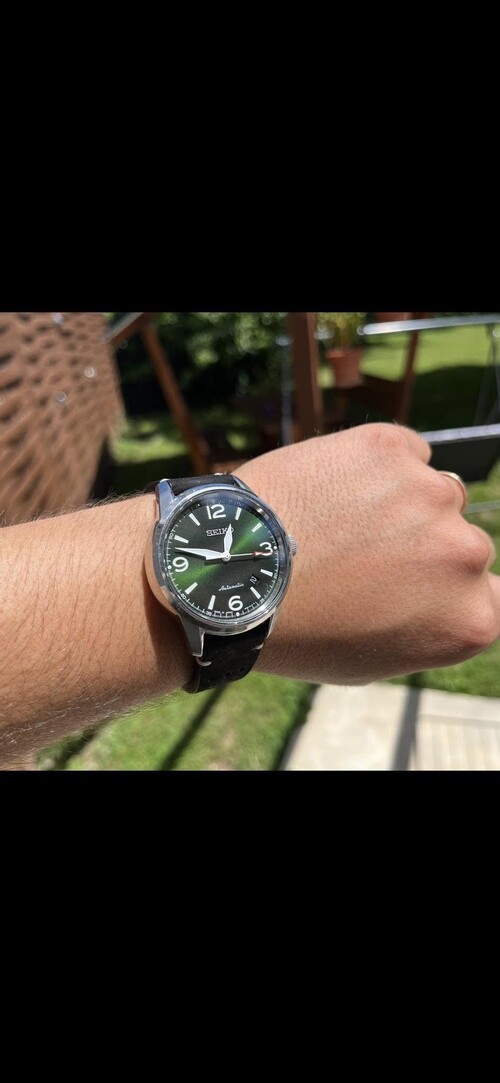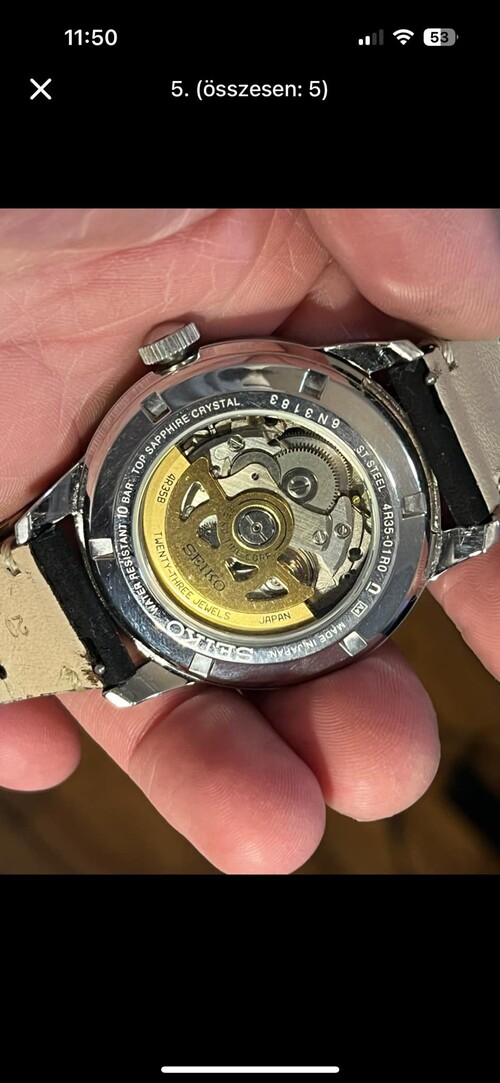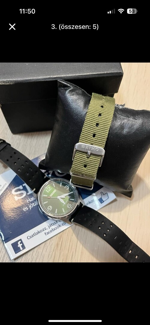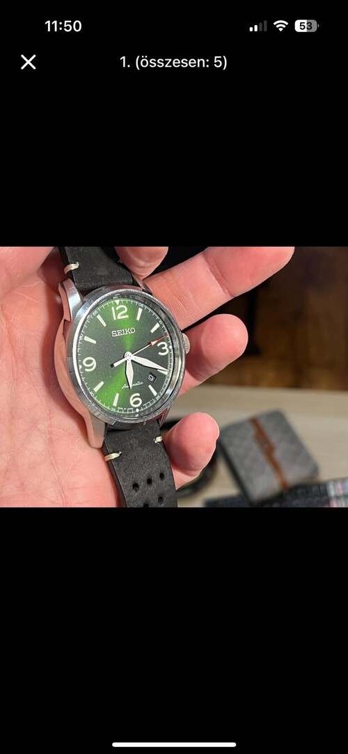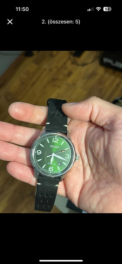 Sziasztok! Eladó a gyüjteményem egyik darabja!SEIKO PRESAGE SRPB05J1Kn. 42mmCsoda zöld számlappal!Eredeti doboza sajnos nincs meg, én is így vettem már. Gyári papírjai, gyári Nato szíja, jelölt csattal megvan, adok hozzá egy -szerintem- parádés vintage bőr szíjat ,én azon használtam.Képen látható állapot, tökéletes működés. 2019-es az óra.Kézzel is felhúzható, másodperc stoppos Japán Automata szerkezet 41 óra járástartalékkal (Seiko Cal.:4R35)Zafír üveg,hátul is "kukucskáló" a szerkezetre 75.000ft, Nyirádon átvehető személyesen.Futár, foxpost a vevő költségére utalás után megoldható.Csere nem érdekel!!!