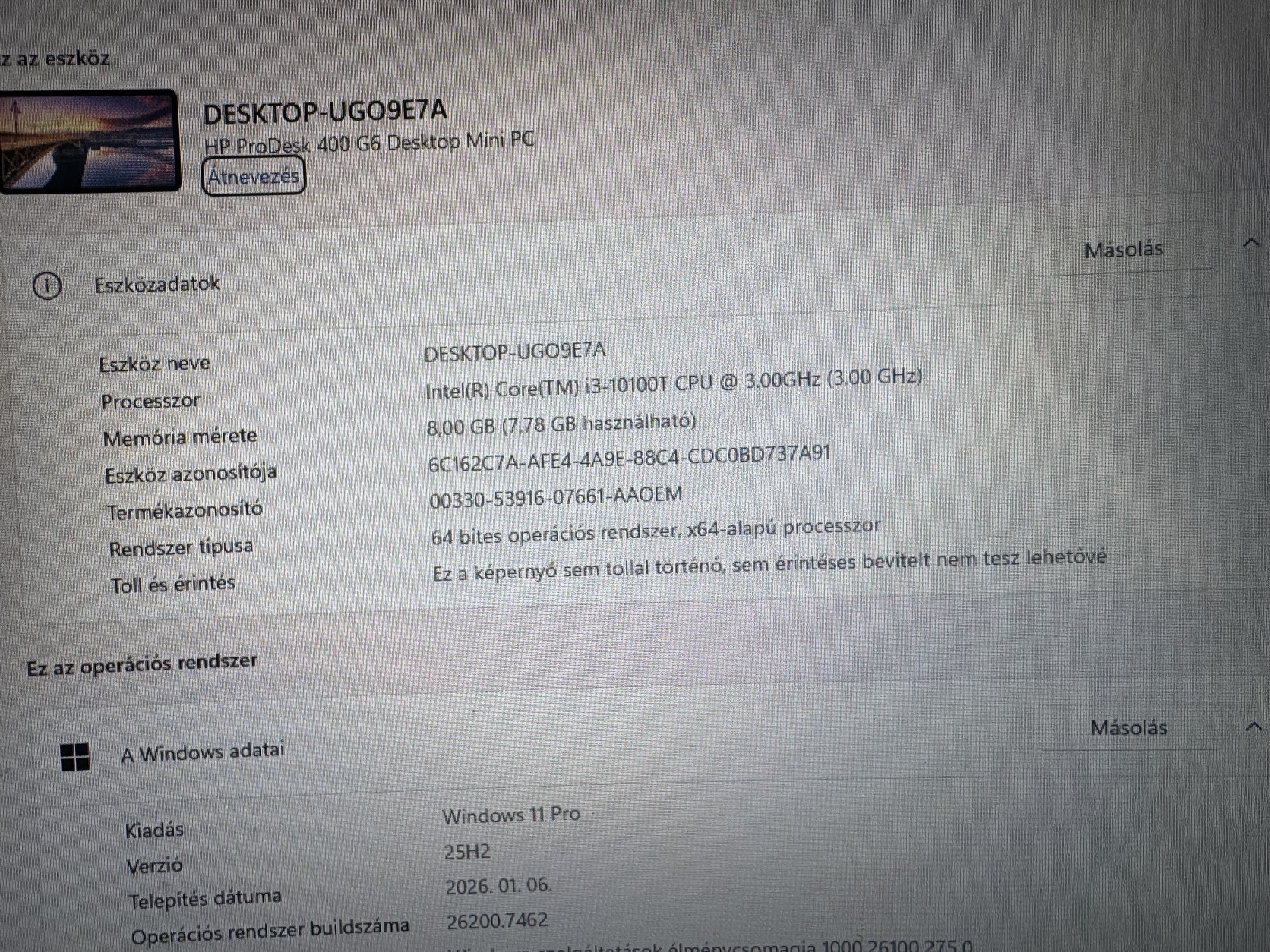 Sérült!!! - HP ProDesk 400 G6 MINI PC 10.gen Intel