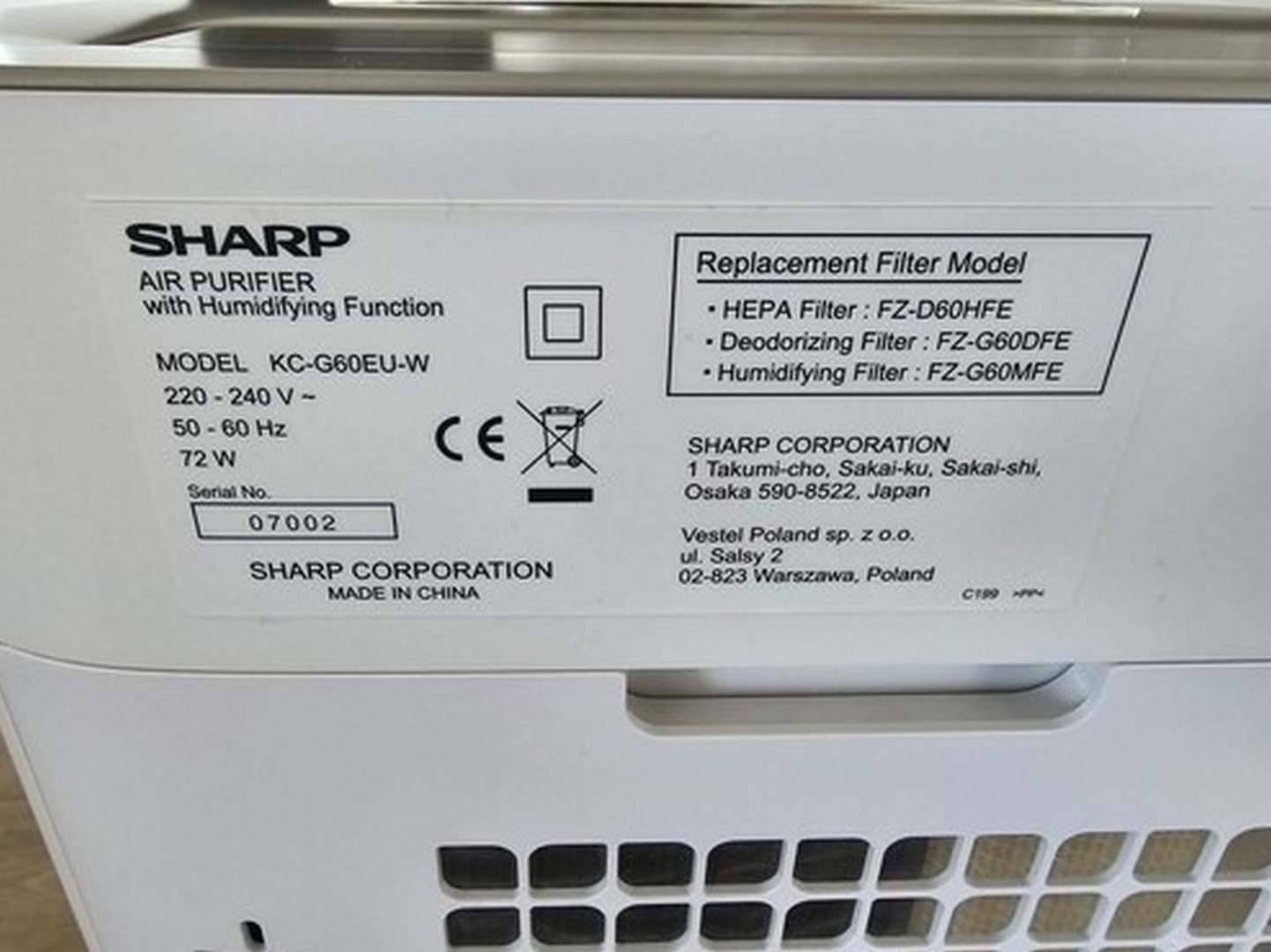 Sharp KCG60EUW Plasmacluster HEPA filteres légtisztító - párásító