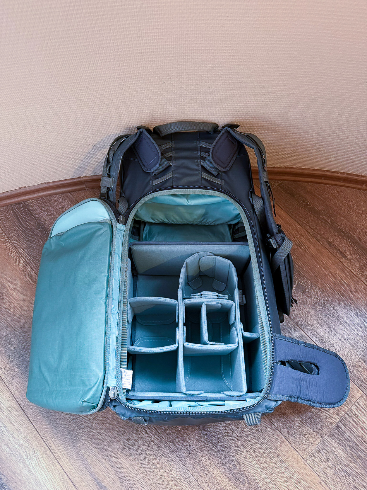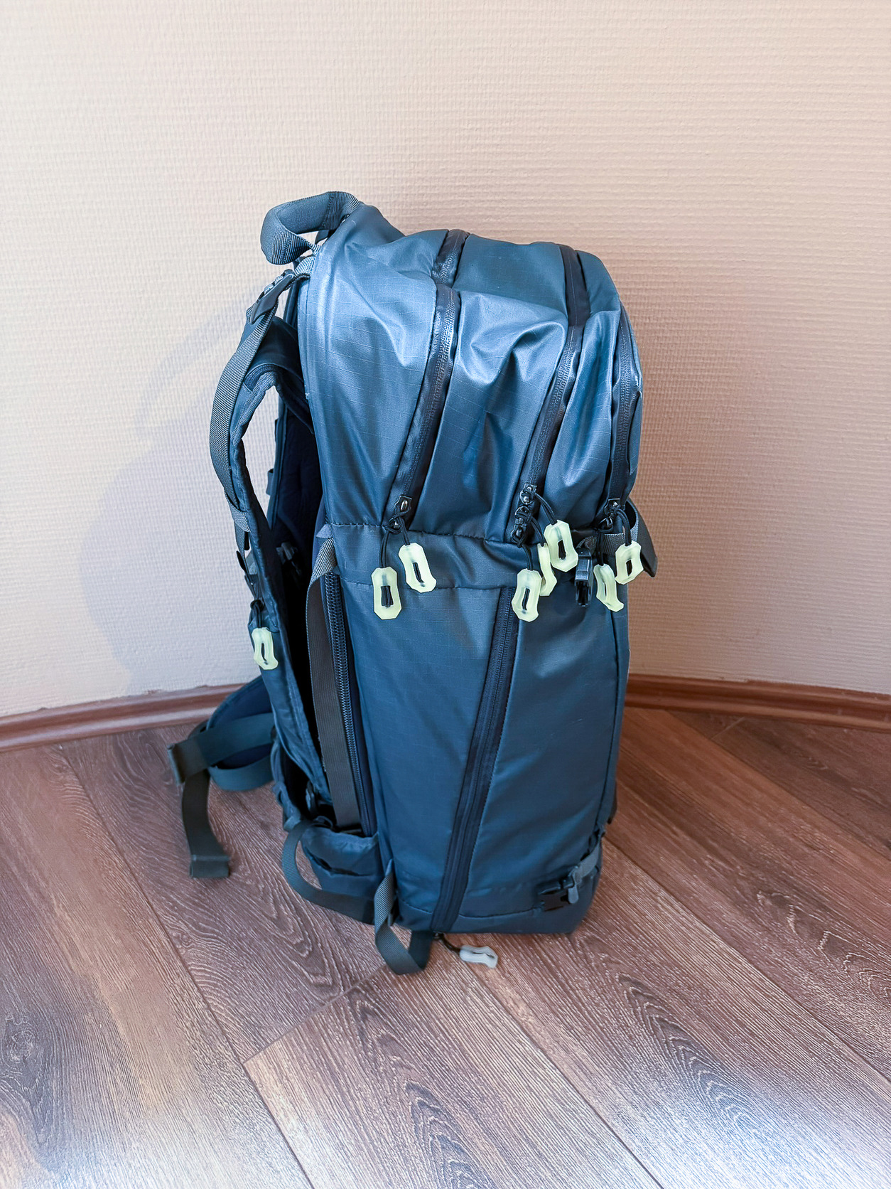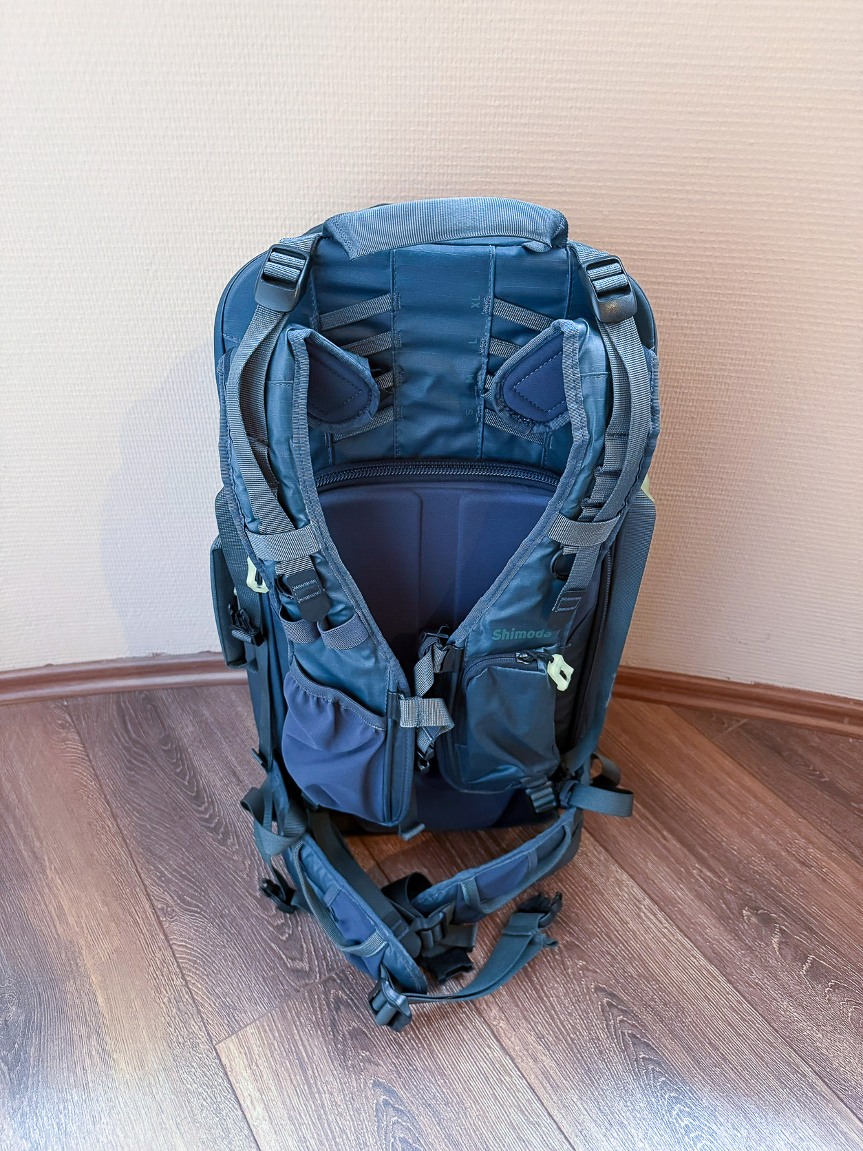 Eladó egy sötétkék Shimoda Explore 40L fotós hátizsák, közepes méretű táskabetéttel (Medium DSLR V2), sötétben világító cipzárhúzókkal, minden tartozékával.