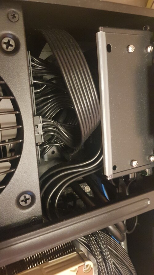 Az SSD keretet módosítanom kellett, mert nem fért be a moduláris kábeles SFX tápegységem, de a kivitelezés igényes lett, az eredeti rögzítés megmaradt, 2db 2, 5" még mindig kényelmesen befér ide, képeken az eredmény.