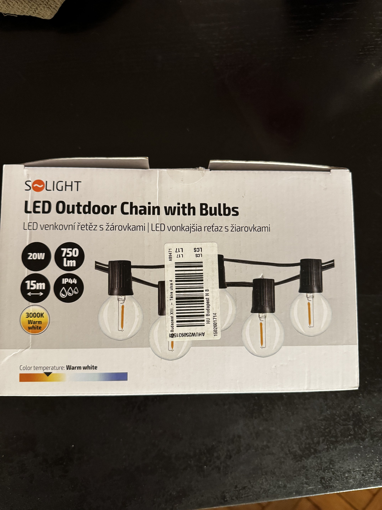 Fényfüzér - beltéri és kültéri használatra egyaránt alkalmas, 15 m hosszúságú, melegfehér színű fénnyel, hálózati tápellátás, 230 V bemeneti feszültség, 20 W energiafogyasztás, vízhatlan, élettartama 20000 óra, IP44 védelmi fokozattal, 3000 K maximális színhőmérséklettel, 5 m hosszú tápkábellel