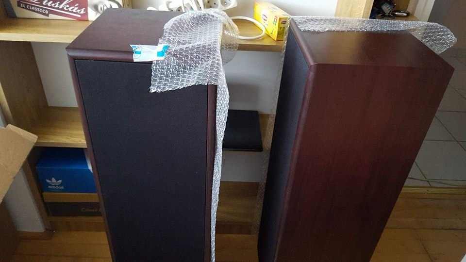 A hangfalak patika állapotú cseresznye fa dobozban.