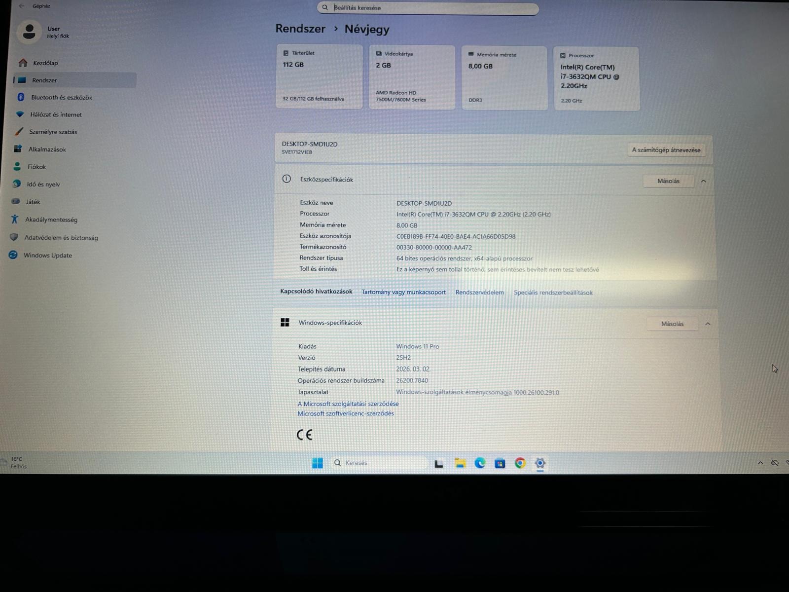 Proci: Intel Core i7-3632QM 2,20 GHz, 6 MB gyorsítótár
