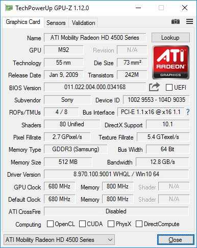 VGA: ATI Mobility Radeon HD 4500 512MB
