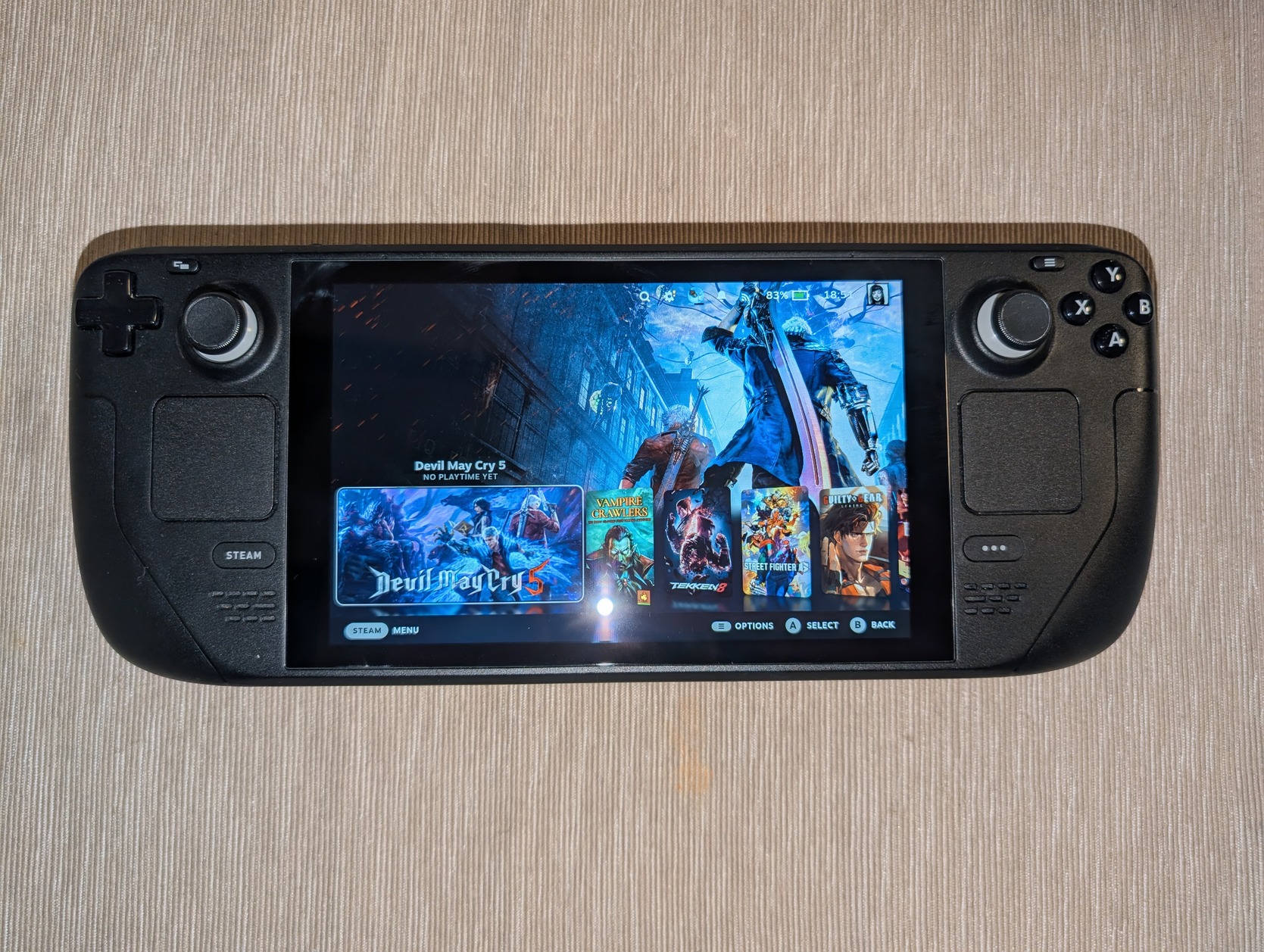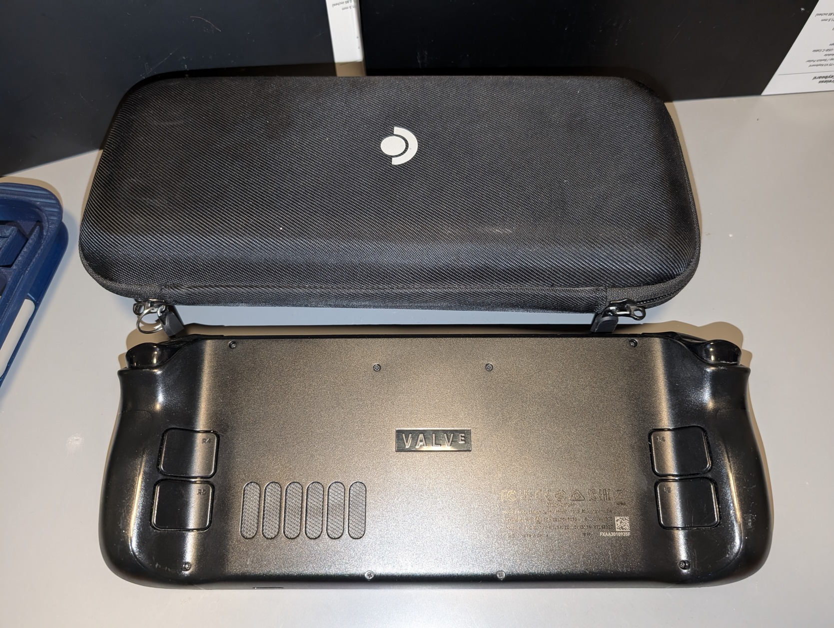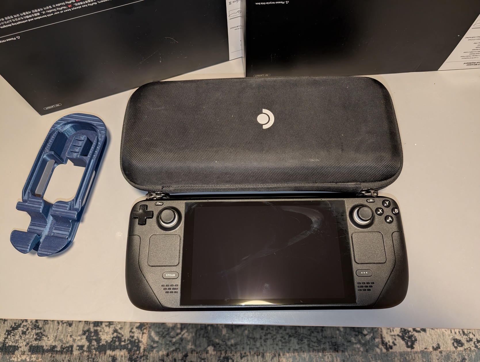 Steam Deck LCD, upgraded from 64GB to a 1TB NVMe (Corsair MP600 Mini). Comes with all original accessories (carrying pouch, EU power adapter), also comes with two JSAUX tempered glass screen protectors and a PLA stand.