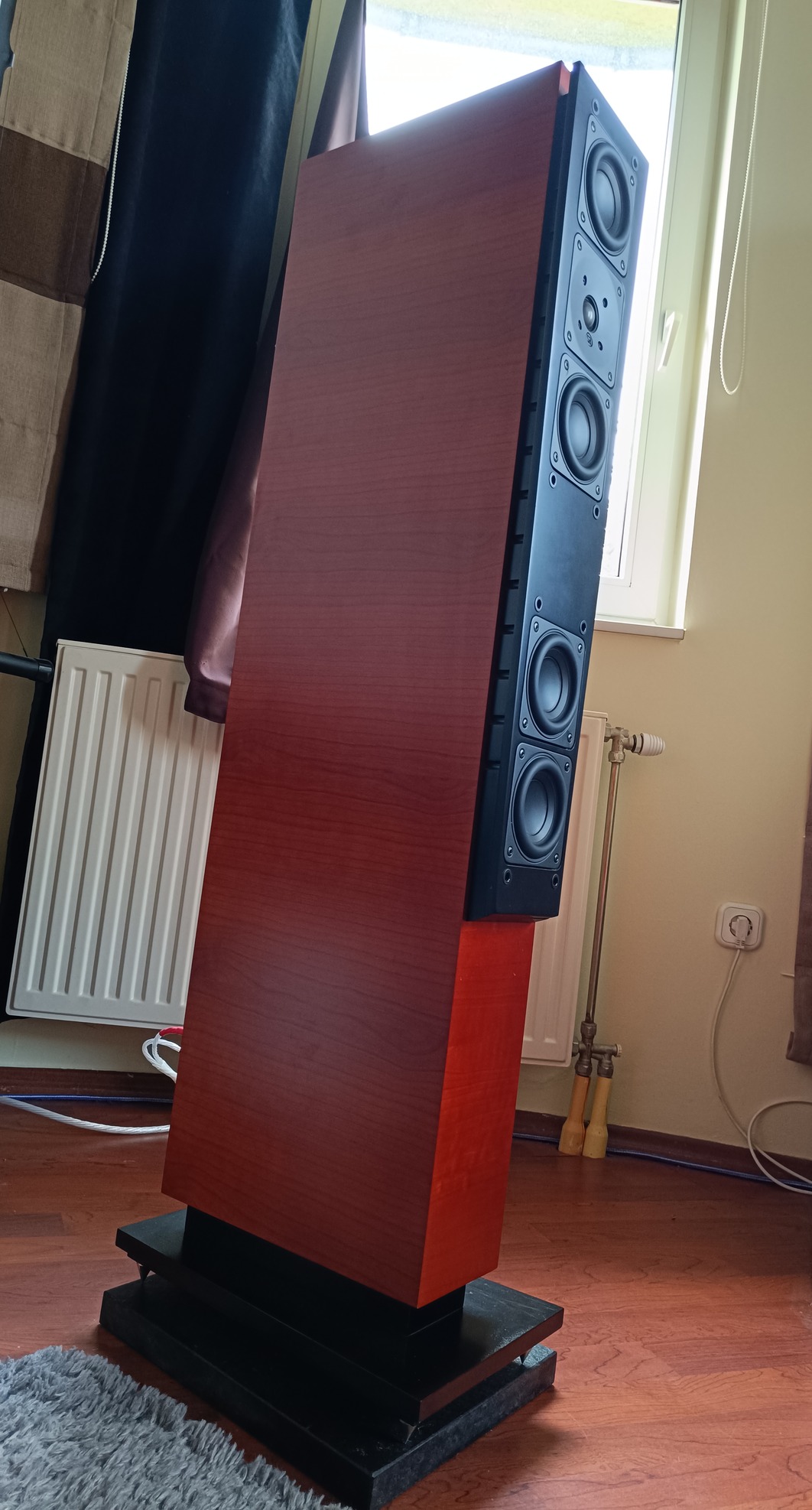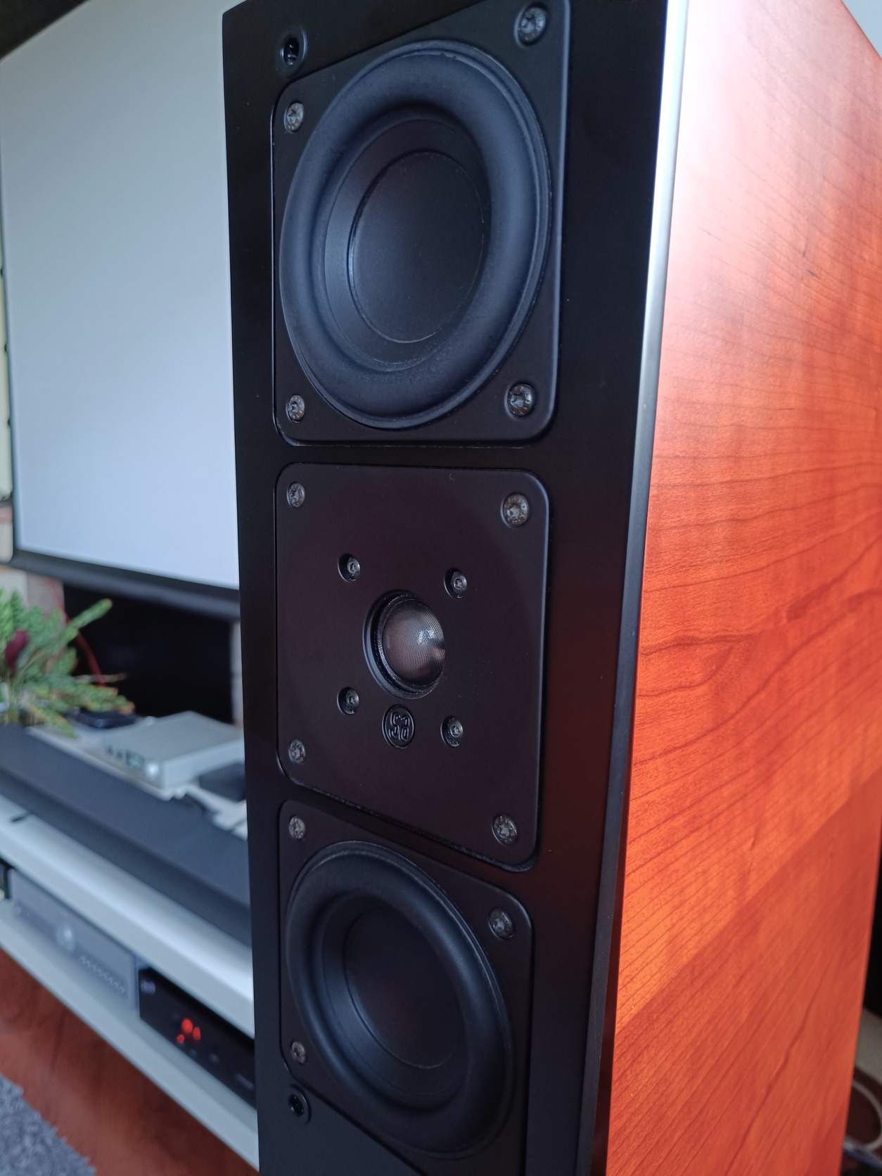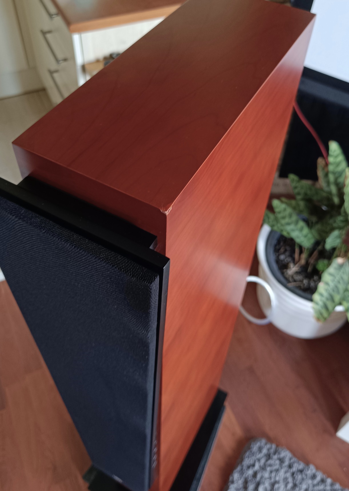 Egyik felső sarkán van egy pici sérülés, ezen kívül 1-2 apró makula előfordul, de semmi komoly. A grillek hibátlanok, a tartó pöckök is mind épek. A hangfalak állapotát 10/9-re mondanám.