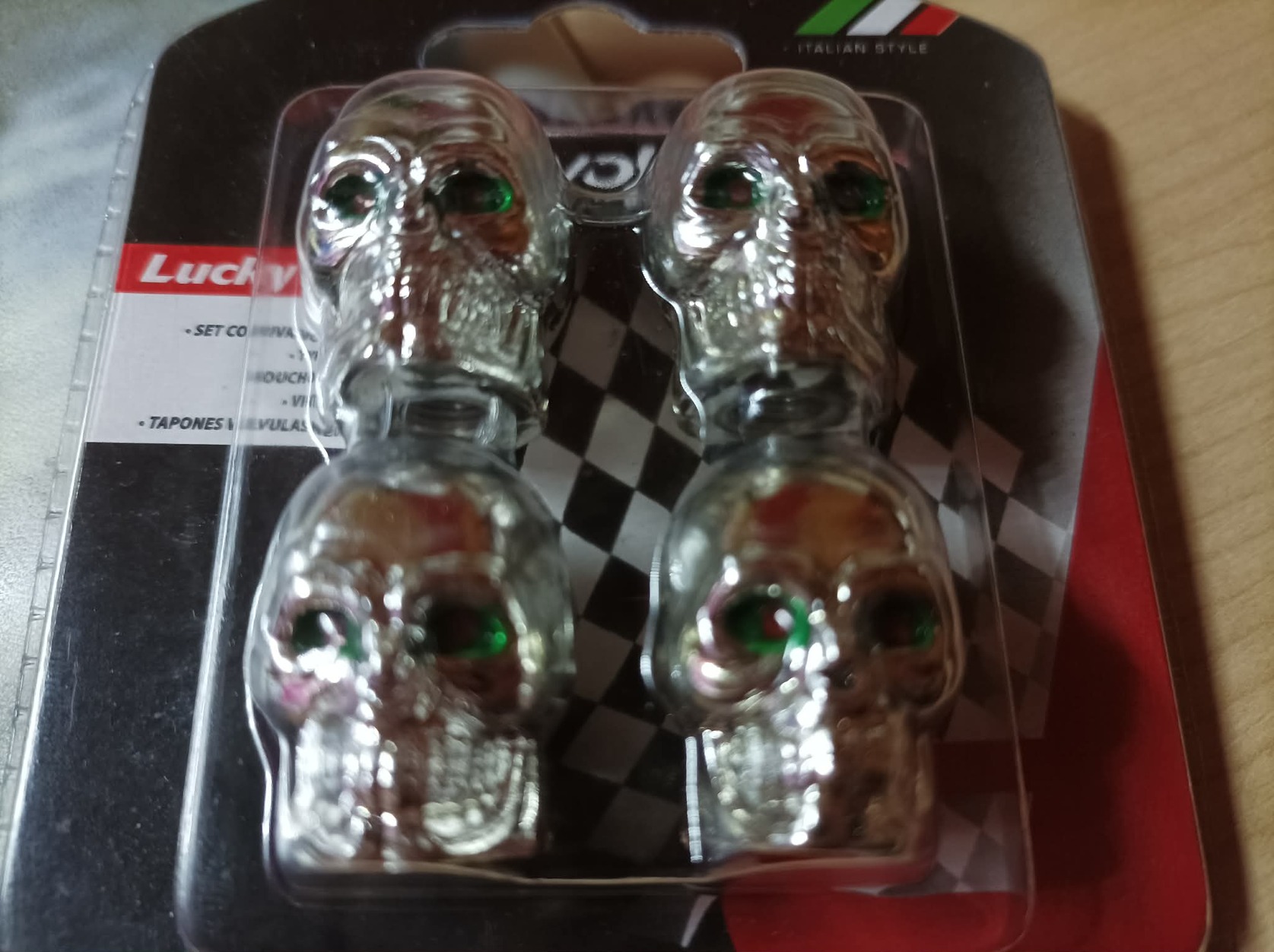 Eladó a képeken látható krómozott, fém, koponya alakú kerékpár szelepsapka készlet, zöld szemekkel.