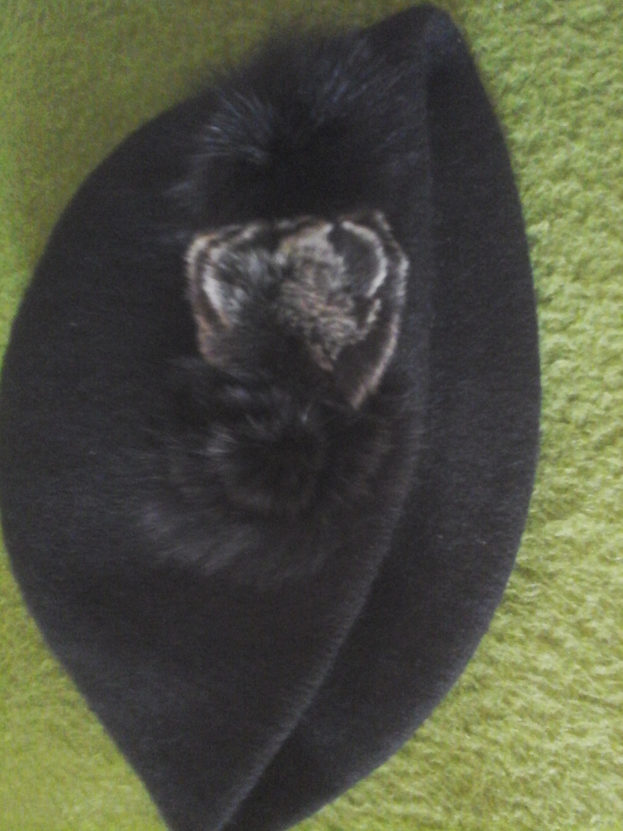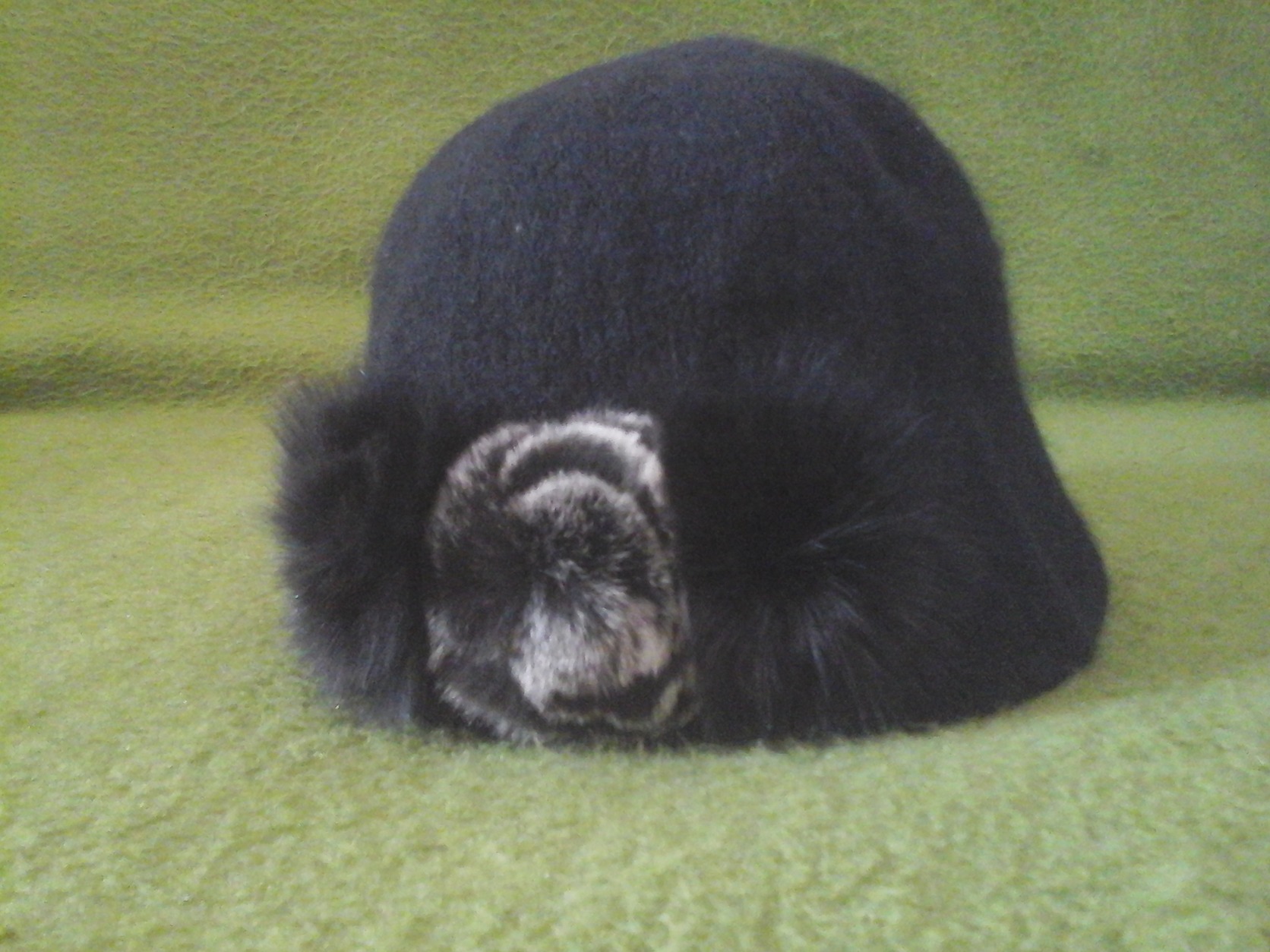 Szép állapotban lévő, fekete színű női sapka, rajta egy angoranyúl szőr dísszel.