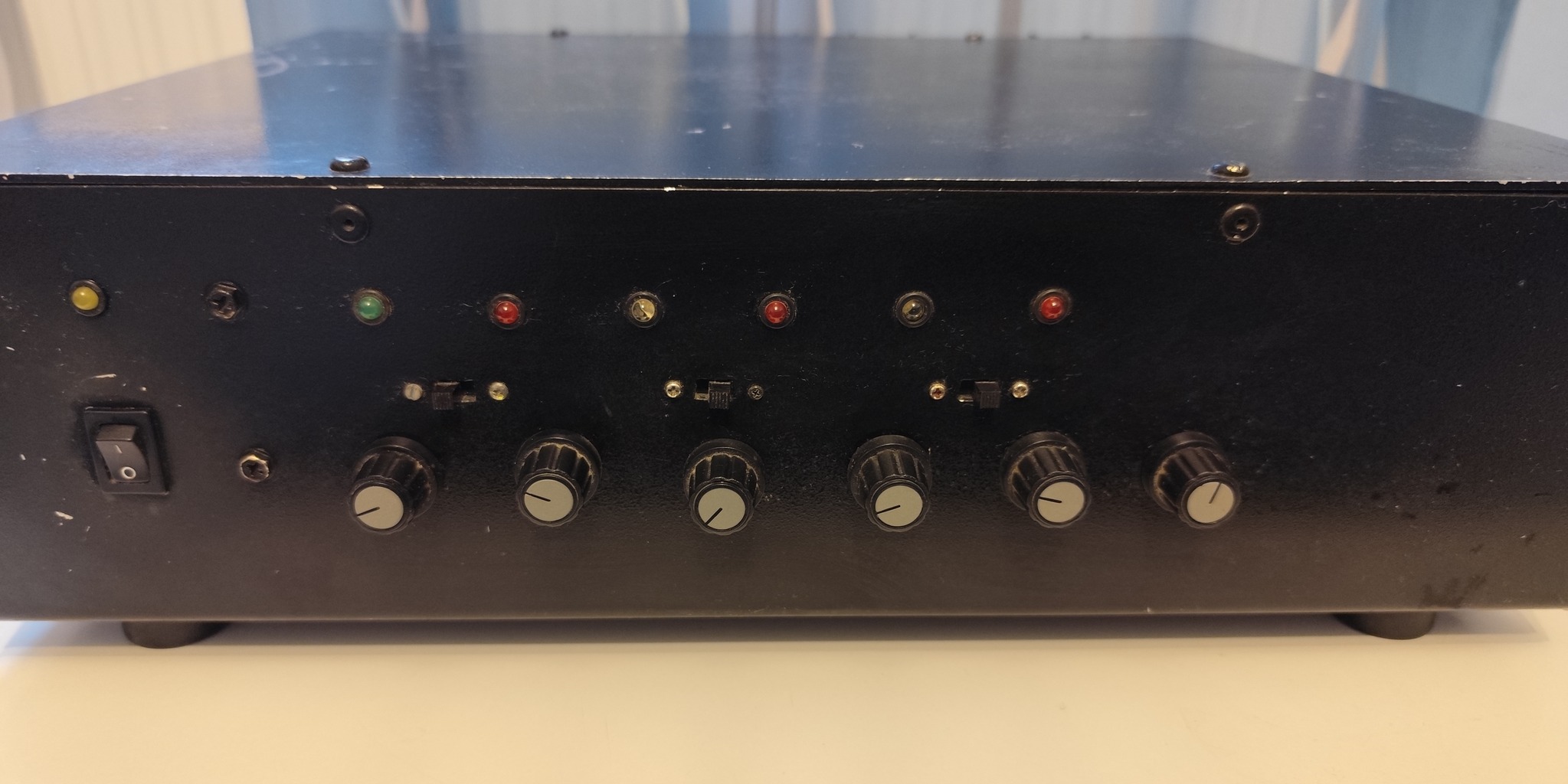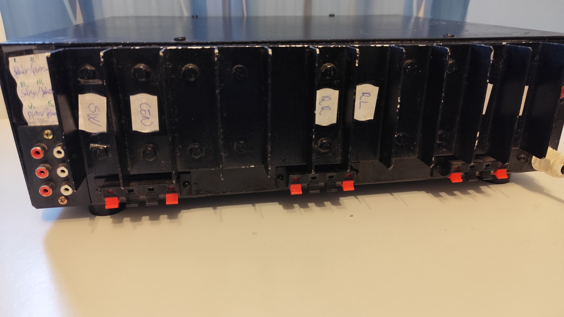 Mind a 6 csatornához külön RCA bemenet tartozik és külön szabályozható a hangerő. Hat hangsugárzót tud egyszerre kezelni, akár 4 ohmost is. Csatornánként ~35W teljesítményt lehet kivenni, ha jól emlékszem (egyedi gyártású, csak én használtam).