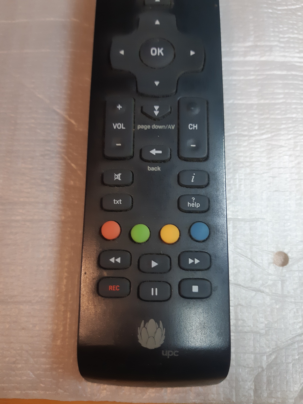 1. UPC (Liberty Global) univerzális set-top box távirányító. Egyszerű, strapabíró modell, infrás vezérléssel, és TV-szinkronizációs funkcióval (TV/UPC váltógomb).