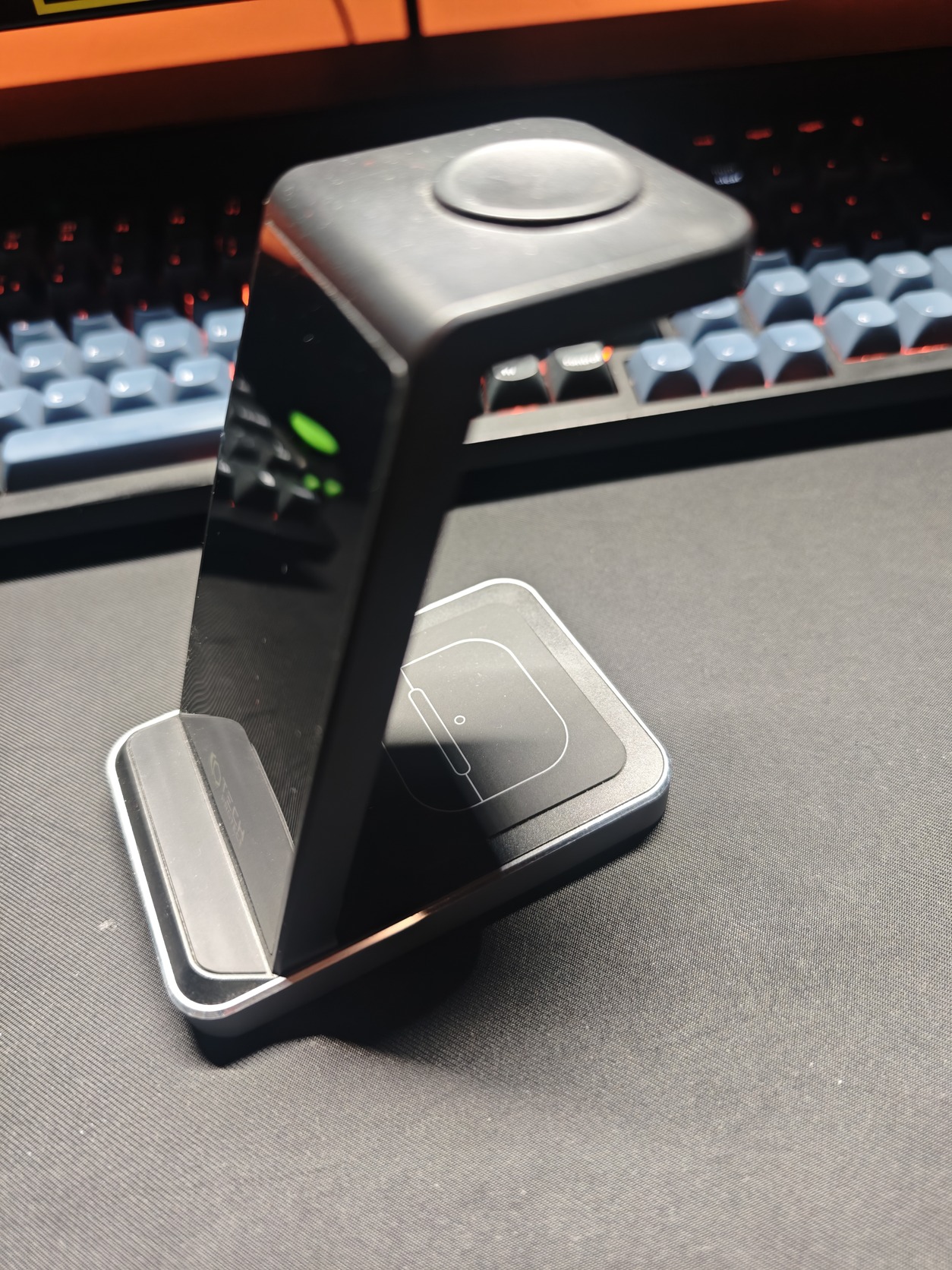 Eladó egy Tech-Protect Qi15W-A26 típusú, 3 az 1-ben vezeték nélküli töltőállomás, amely iPhone, Apple Watch és AirPods készülékek egyidejű töltésére alkalmas.