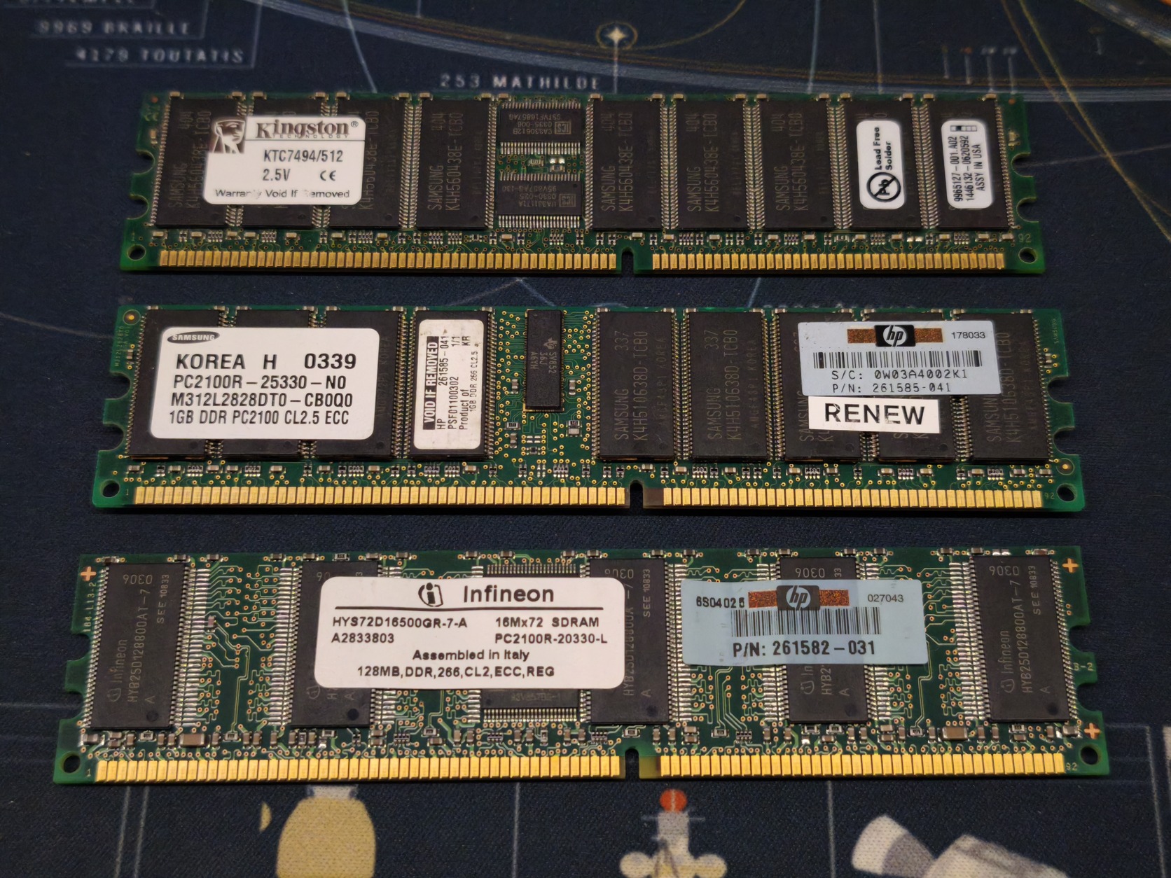 Eladó 3db teszteletlen DDR ECC RAM. A címkék alapján 512, 128, 1GB modulok.