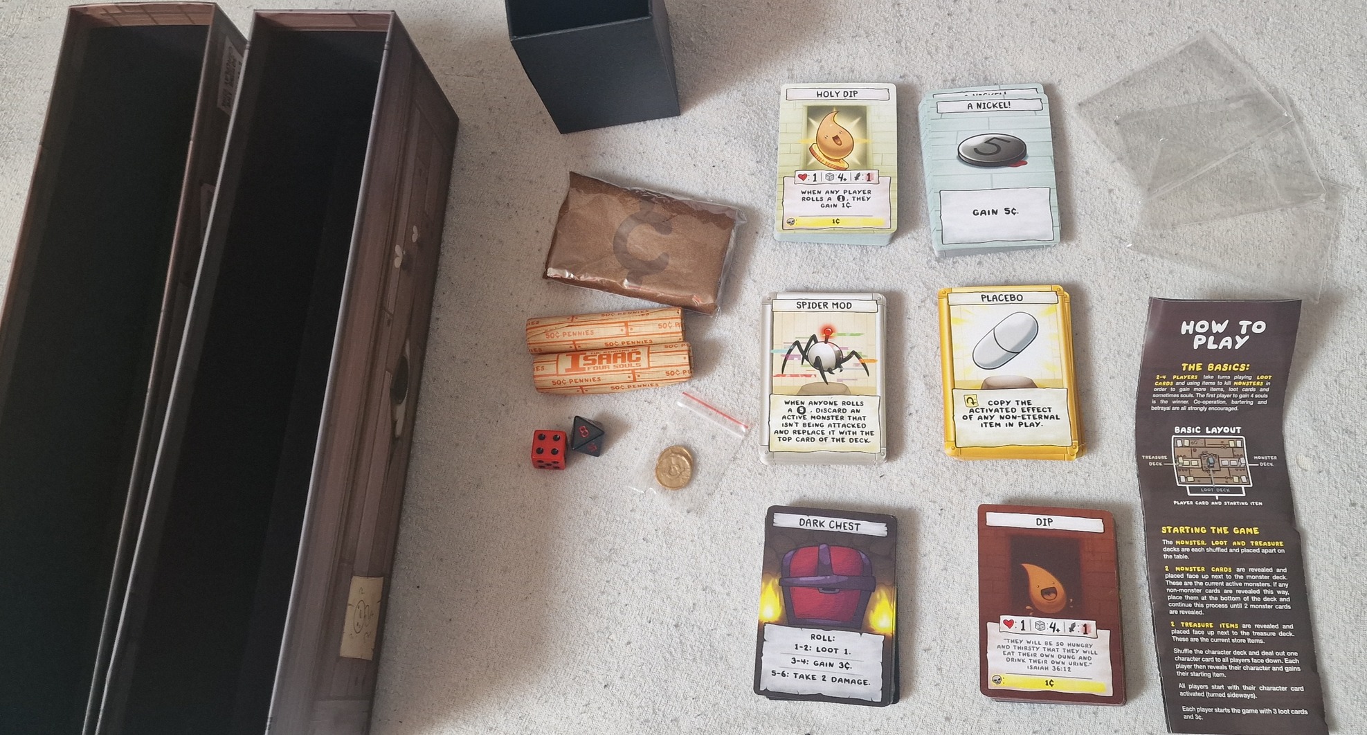 Eladó egy hiányos The Binding of Isaac Four Souls First Edition kártyajáték ami a híres (és szerintem a legjobb) rogue-like videojáték alapján készült. Sajnos azért hiányos mert egy jópár kártyát beraktam egy keretbe anno,de aztán megsérült maga a keret és a kártyák is,úgyhogy azok nincsenek már meg. Minden más tartozéka megvan,és bontatlanok is,a penny-k illetve a zsákja is pl,de képeken fotóztam őket.