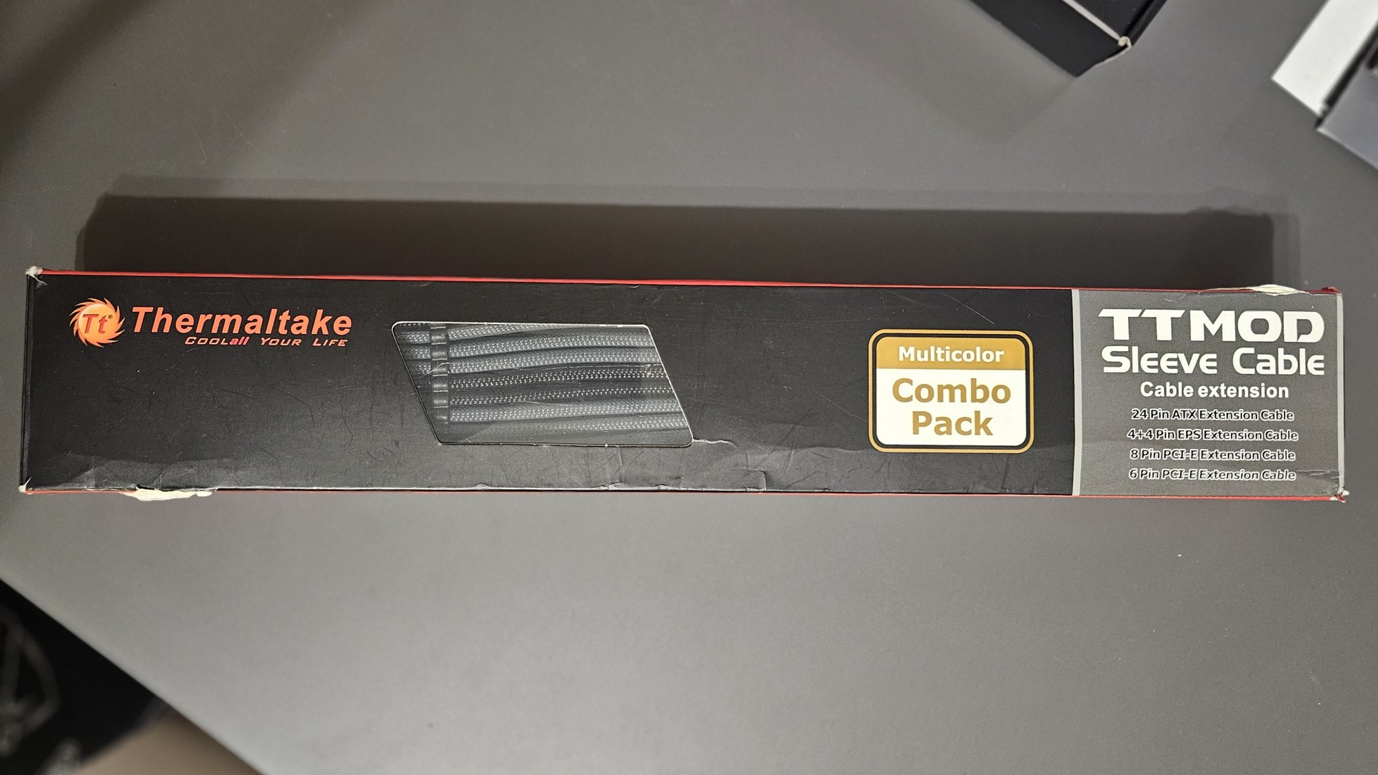 Eladó Ttmod (Thermaltake) fekete-szürke hasirsányázott tápkábel hosszabbító. Az egyik 6 pines PCIe kábel pöcke letört, egyébként többi kábel hibátlan.