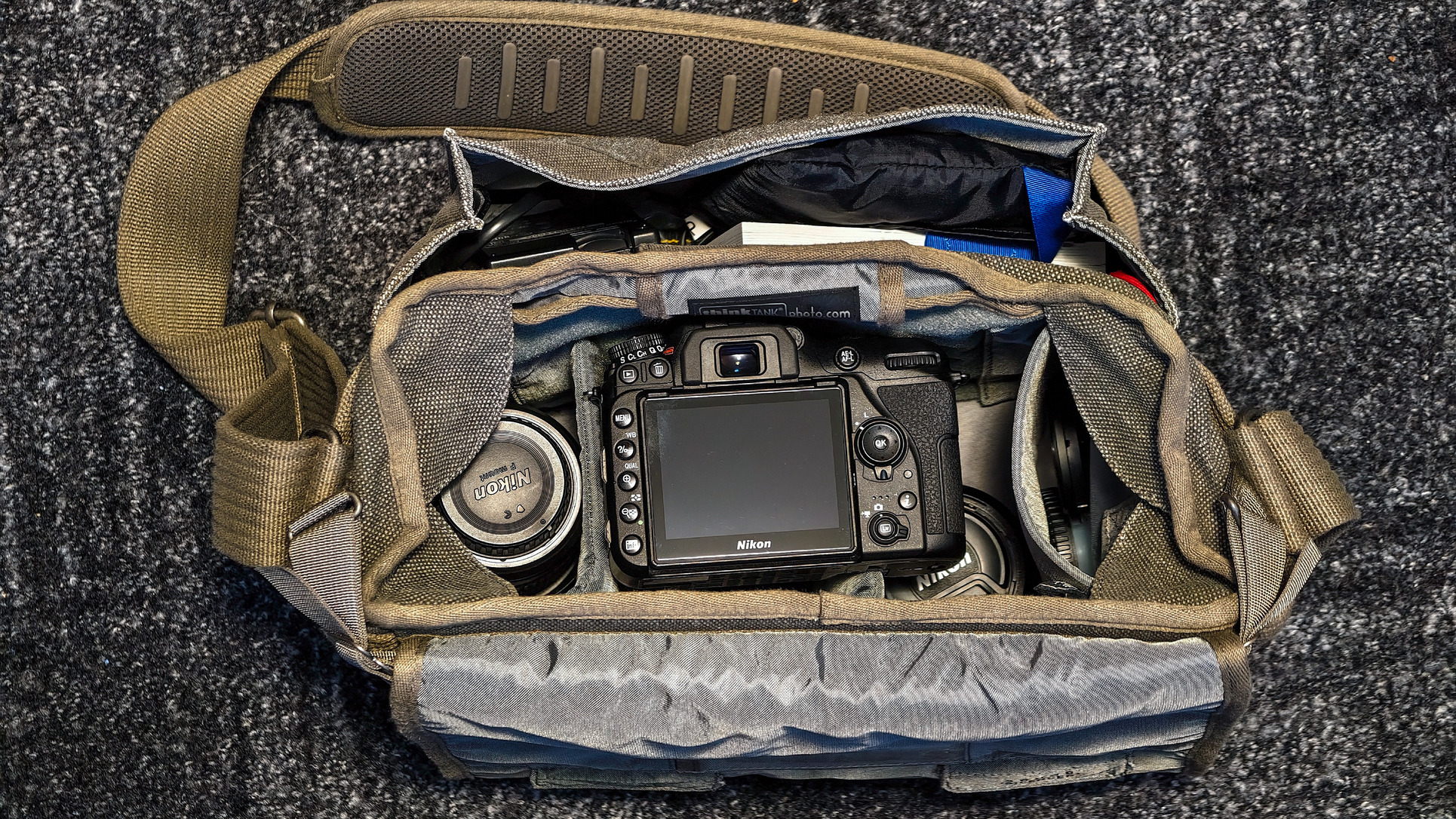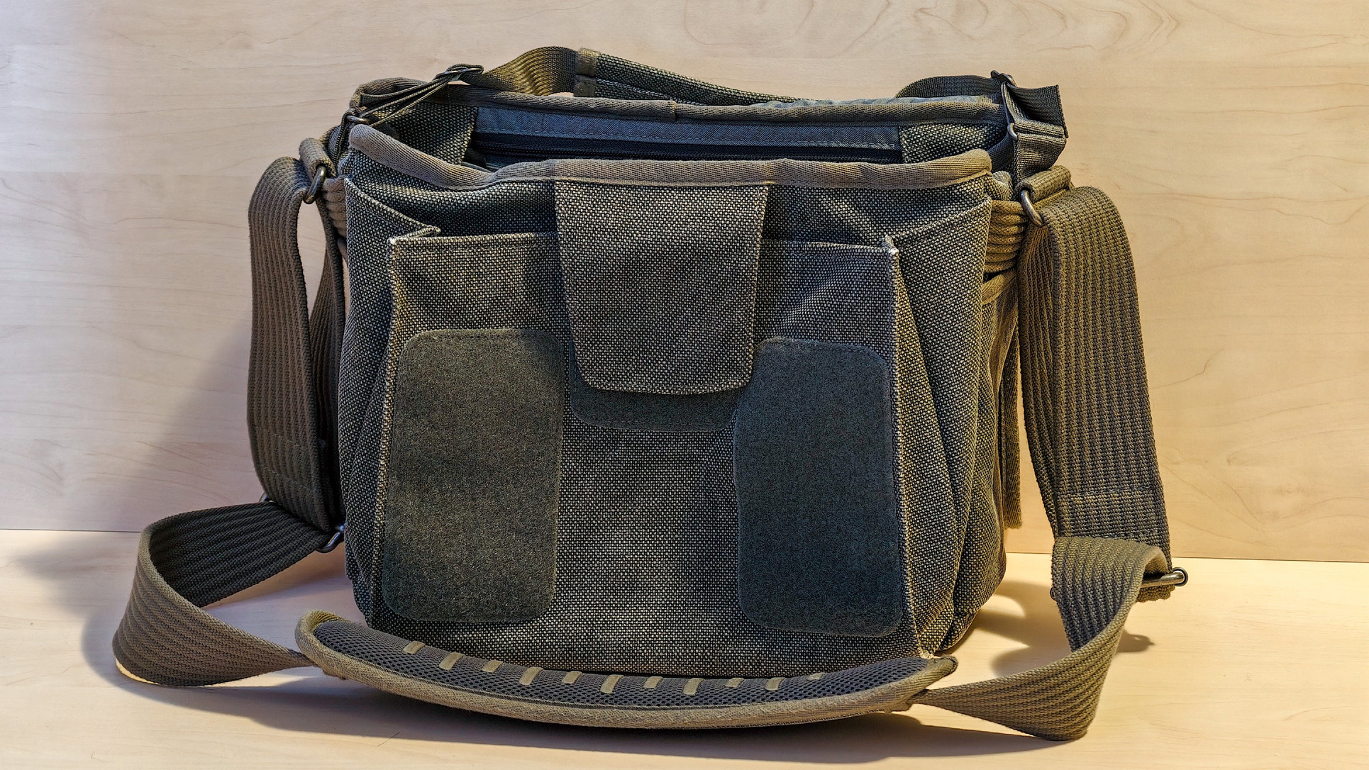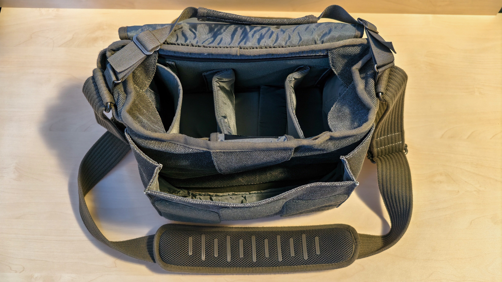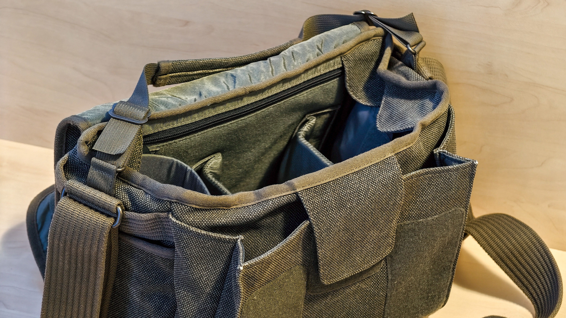 Belseje variálható, jár hozzá két extra elválasztó (tépőzáras) illetve egy esővédő huzat is. Kialakítása nagyon ötletes, rengeteg hely van benne, a lenti listában szereplő cuccokat bekebelezi. Tágas, mégsem óriási méretű, nem zavaró az ember vállán. Városi fotós sétához, túrázáshoz, fotós rendezvényekhez stb tökéletes, teteje kihajtható, rögzíthető, így könnyű pl egy gyors objektívcserét megcsinálni. A tépőzár nagyon erős, így észrevétlenül senki nem fogja kinyitni! Fotós cuccok tárolásához is jó, vagy bármi egyéb tárolására, ha ki vannak belőle véve az elválasztók, akkor normál oldaltáskaként funkcionál.