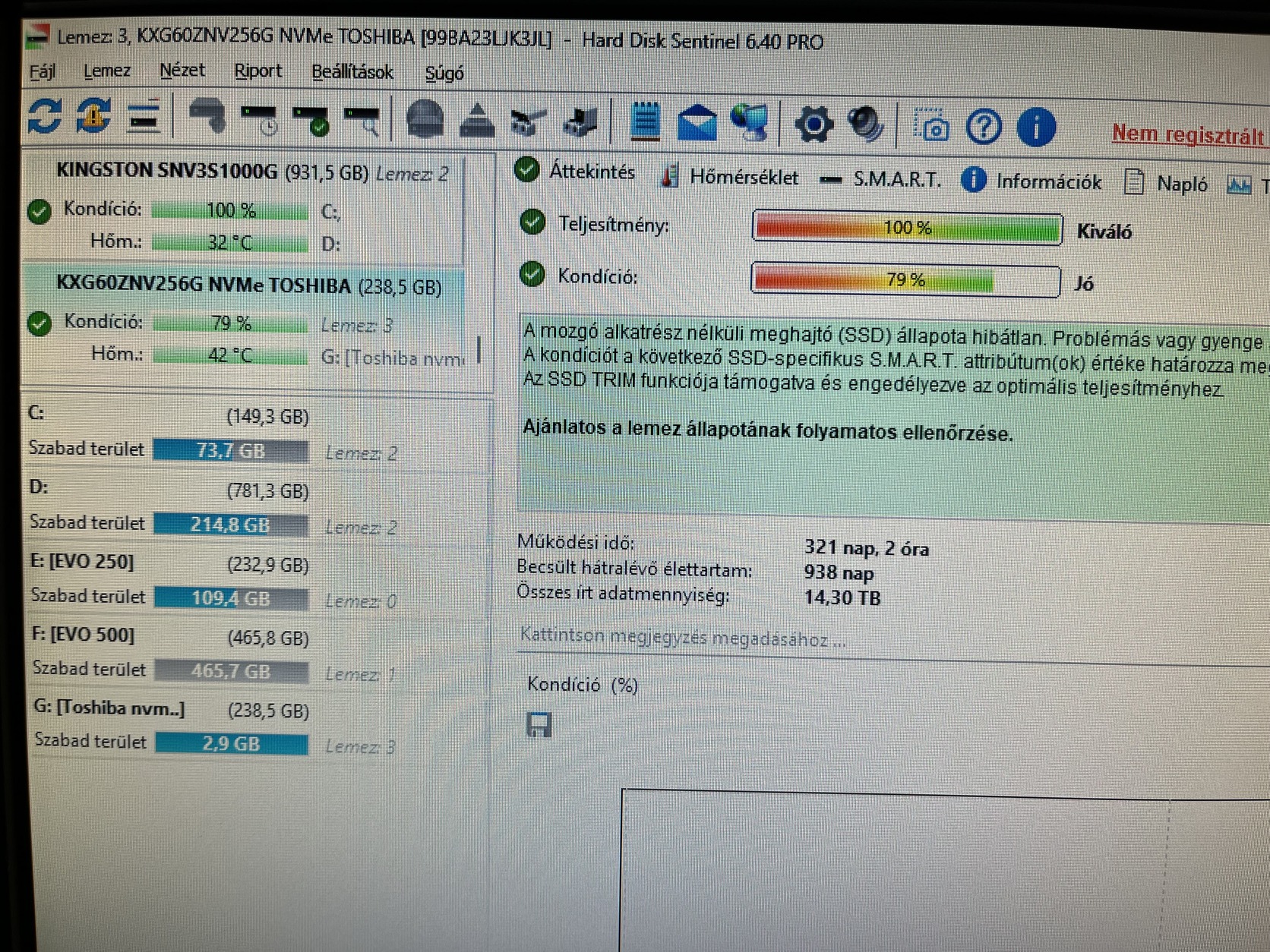 Toshiba KXG60ZNV256G típusú nvme eladó. 100/79% , de csak 14,30TB az összes írt adat.