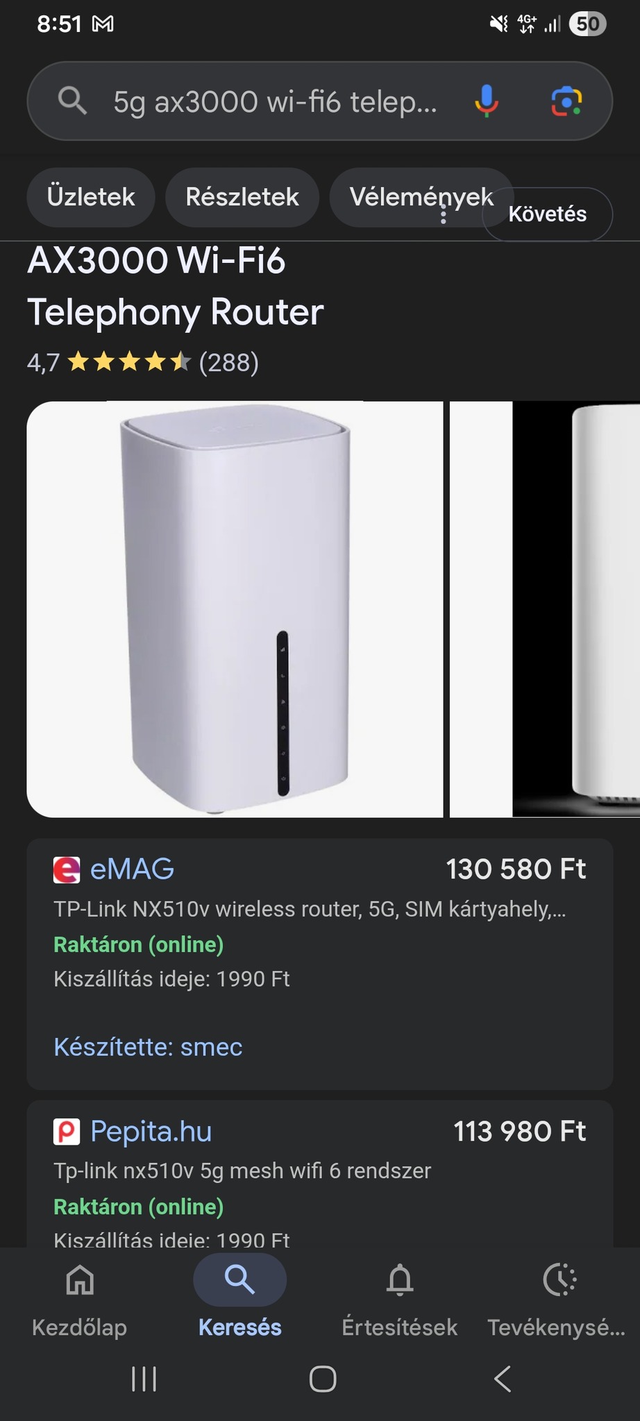 Eladó a Képen Látható 5G Wifi Router egy pici hibája van hogy az egyik gumi tappancs hiányzik. Ahogy a képen is látszik. További info. https://www.emag.hu/tp-link-wireless-router-5g-sim-kartyahely-ax3000-dual-band-wi-fi-6-3-x-gigabit-csatlakozo-feher-nx510v/pd/D9HPSQYBM/?cmpid=105359&utm_source=google&utm_medium=cpc&utm_campaign=(HU:_Without_Whoop!)_Shopping_Ads_-_3P_No_sales_-_Servers_and_Networking_-_H%C3%A1l%C3%B3zatok_%C3%A9s_megfigyel%C5%91_rendszerek&utm_content=117265965988&gad_source=1&gad_campaignid=11095931910&gbraid=0AAAAADKsiyGwpxbtPeZqlnw31mwGI9UYV&gclid=CjwKCAiAtq_NBhA_EiwA78nNWDkBM-88MRER0GXyVf9RXoIPDmIW6iROp7rICTn6b_xmNUIoEm7QfRoCAGkQAvD_BwE#description