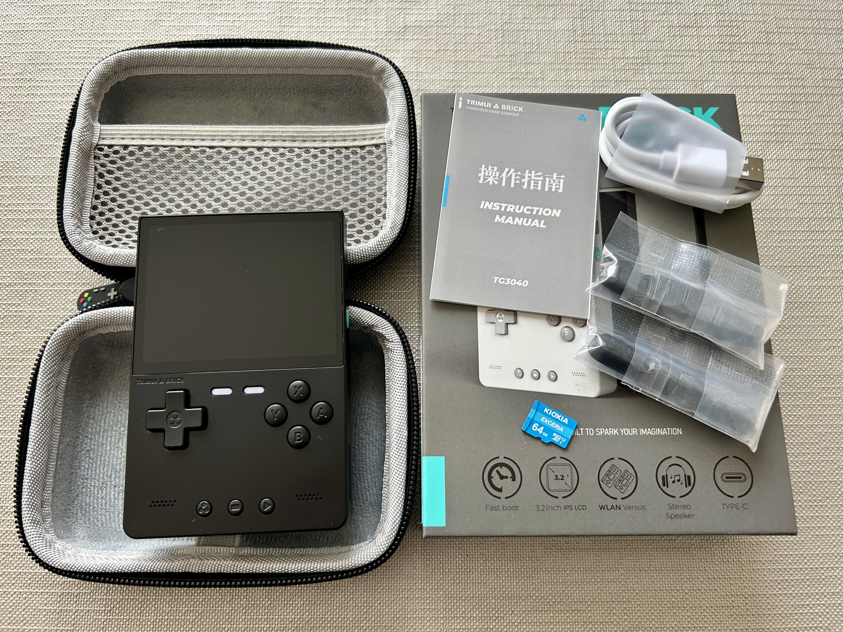 Dobozában minden tartozékával: töltőkábel, 64GB Kioxia (nem noname) microsd kártya, két készlet trigger gomb, plusz ajándék kemény hordozó tokkal.