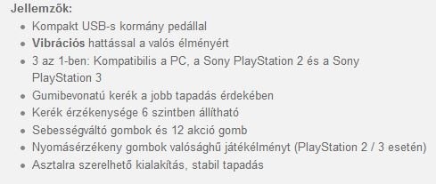 A vibrációs visszajelzési hatások realisztikus autóversenyzői élményt biztosítanak 3 az -1-ben: PC-vel, Sony PlayStation 2-vel és Sony PlayStation 3-vel is kompatibilis Gumi borítású kormánykerék a tovább javított fogáshoz A kormány érzékenysége 6 szinten állítható 2 kormányra szerelt váltókar és 12 akciógomb Nyomásérzékeny gombokkal a valósághű játékélményhez (csak a PlayStation 2/3-höz csatlakoztatva) Erős szorítóval és tapadókoronggal a sziklaszilárd asztalra rögzítéshez. Egyszer-kétszer használt, teljesen új.