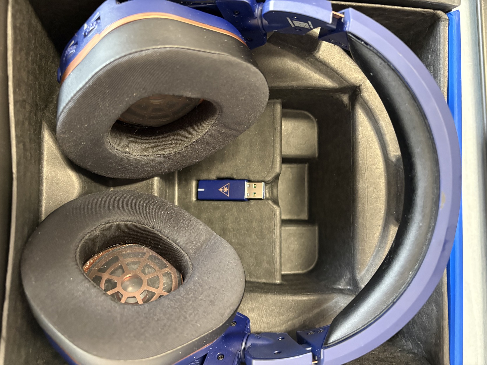 Doboz, USB transzmitter jár hozzá. Sajnos az USB-C töltőkábele eltűnt, de bármilyen USB-C kábellel tölthető.