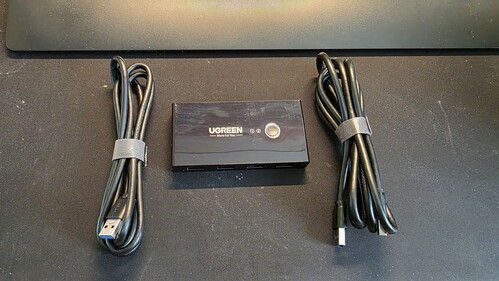 Eladó egy USB switch. Két gép között lehet váltani, 4 port a csatlakoztatható eszközöknek. Tápellátást a csatlakoztatott számítógépről kap, opcionálisan külön 5V-al megtáplálható külön micro USB csatlakozóján (ehhez táp/kábel nem volt tartozék).