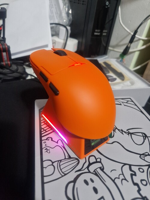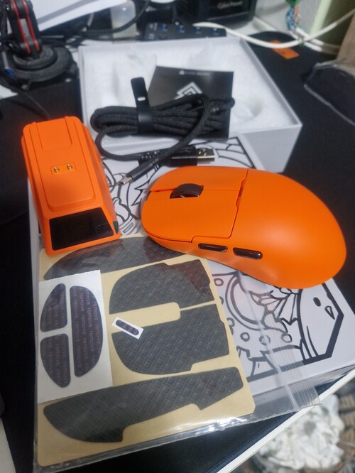 Specs.: PAW3950oc, 8K, 118x63x38mm, 56g, Fine Ice grippy coating, RGB 8K dongle+töltő dock konfigurálható kijelzővel, 100M Huano tr.greens, extra szett PTFE egértalp, extra grip tapes, programming software+web based configurator