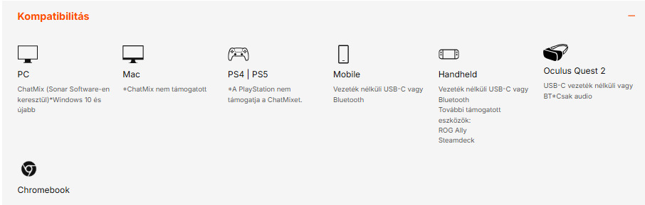 Ez a készülék csatlakoztatható: PC-hez, PlayStationhez, Switchhez, Chromebookhoz, Mac-hez, VR-hez, kézi eszközökhöz és mobil eszközökhöz is.