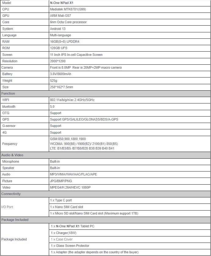 2000x1200 HD IPS Touchscreen N-One NPad X1 Helio G99 MTK8781 Octa Core 16GB RAM 128GB ROM Netflix Widevine L1 Face Unlock 4G LTE 11 Inch 2K Screen Android 13 Tablet EU Version